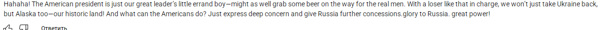 >Hahaha! The American president is just our great leader's little errand boy-might as well grab some beer on the way for the real men. With a loser like that in charge, we won't just take Ukraine back, but Alaska too-our historic land! And what can the Americans do? Just express deep concern and give Russia further concessions. glory to Russia. great power!