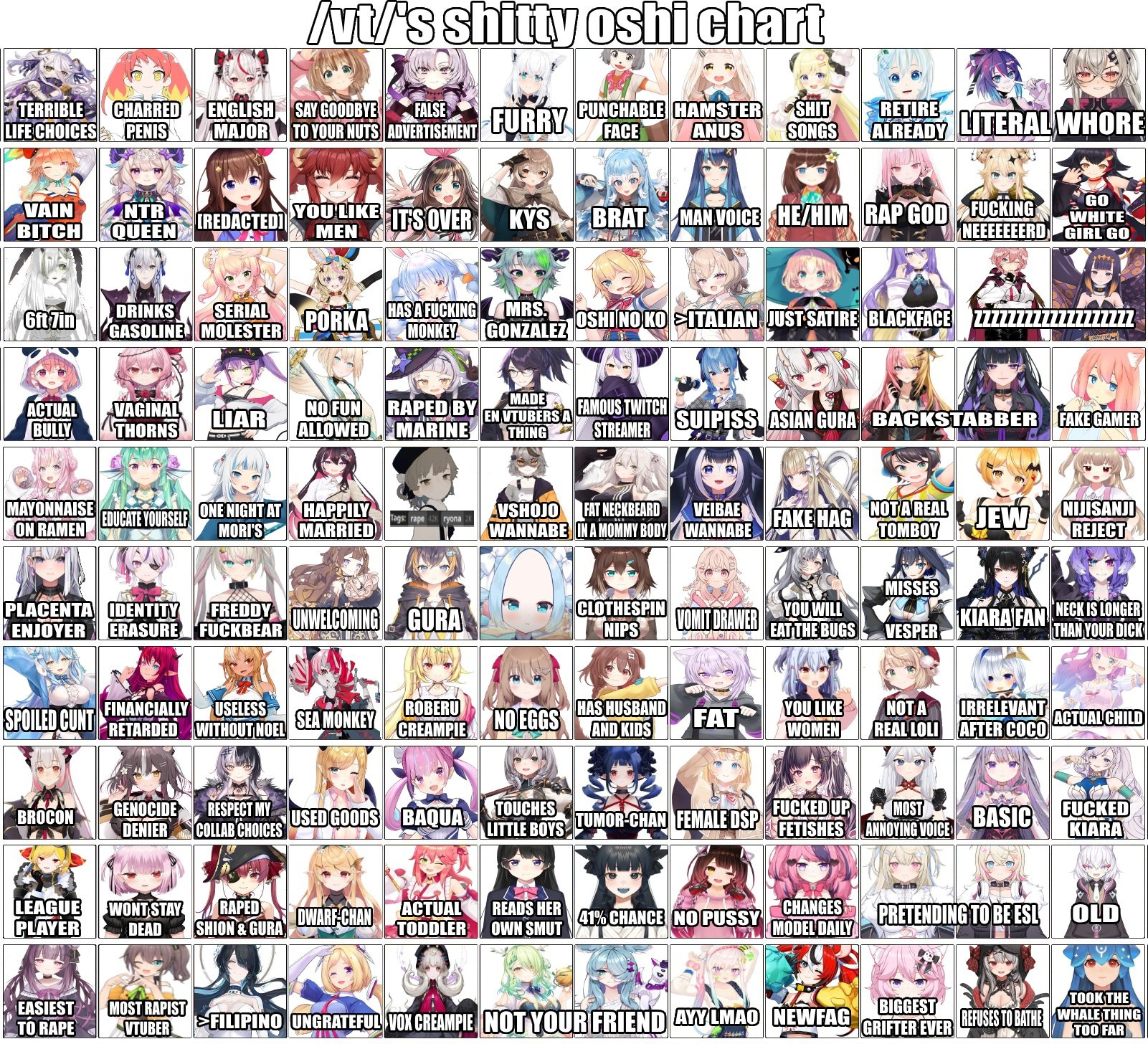 [Coswhore-tier] Kiryu Coco/Kson - косплеер/поехала на идее возвращения к корням, в итоге не была принята Moona Hoshinova - косплеер Projekt Melody - камвхора 利香(riсa) - камвхора Takanashi Kiara/keekihime - косплеер/в 16 лет выгнали из дома Tsukumo Sana - косплеер