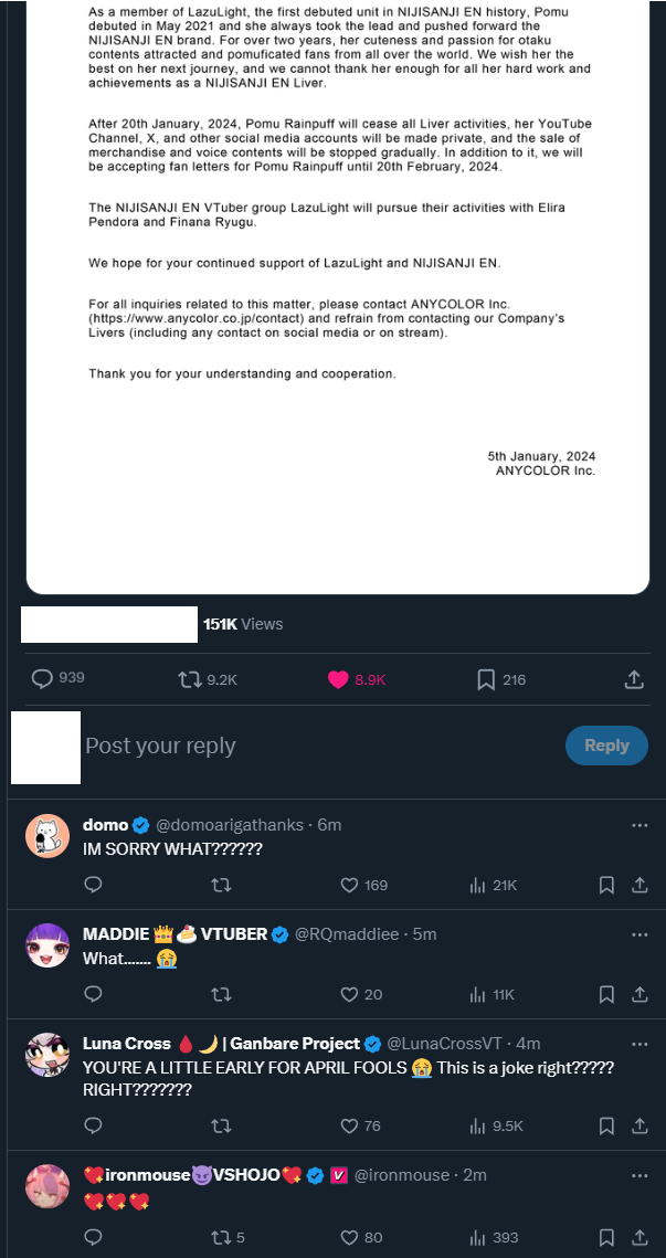 Хололайв отказывается от схемы "два 3D концерта в год", для чубы с 3D моделькой (день рождения и годовщина дебюта) Пишут, что слишком много времени и ресурсов уходит, на разные камео и студийную работу. С апреля 2024 у каждой чубы будет только один 3D концерт, который можно потратить на любой повод, не обязательно день рождения. Всё во благо снижения нагрузки и поддержки талантов. В конце, обещают новые форматы: концерты на улице, вэрайети шоу и прочее.