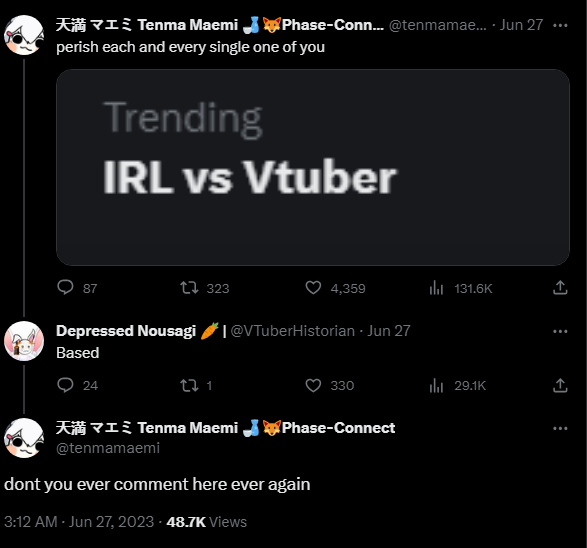 Западным витуберам в целом хотя бы хватает мозгов идти на твитч, кстати. Но есть целая плеяда долбоёбов, упорно стримящих на ютубе <10 зрителям. Им невдомёк, что нижисанжи и хололайв в своё время пошли на ютуб, потому что витуберы были про видео, а не про стриминг, и поэтому все тусовались именно на ютубе. Впрочем, сейчас на ютубе есть и рейды, и внятные рекомендации - но это появилось совсем недавно, и всё равно для новичка твитч лучше по ряду причин.