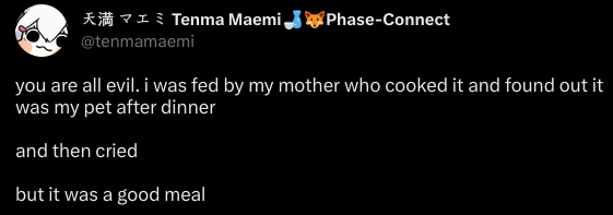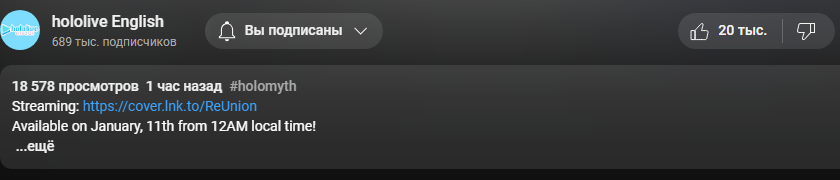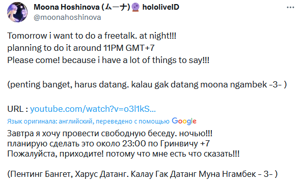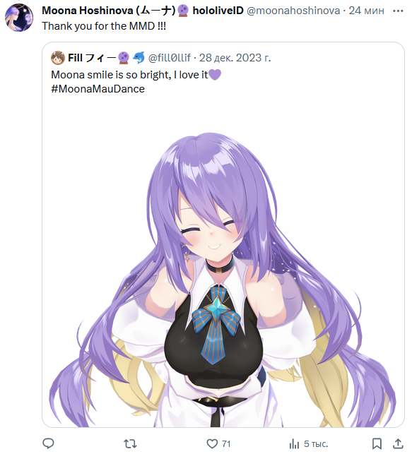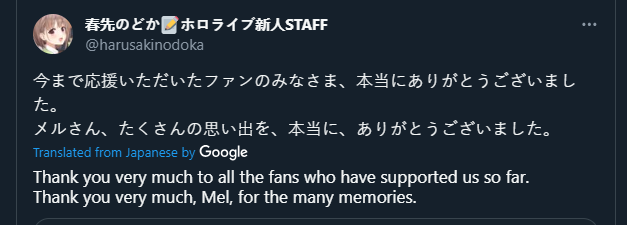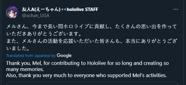 >Не верится, что уже год, как я устроился в ковёр. >С тех пор многое изменилось, в основном к лучшему. >Да, изменения происходят медленно, учитывая бюрократию и пристальное внимание публики, но я думаю, что все в ковре стараются, чтобы исправлять старые ошибки и не совершать новых. >Руководству не всё равно, даже если это не сразу проявляется. >Мне здесь очень нравится, и я могу искренне сказать, что я счастлив и люблю свою работу. >Видеть радость фанатов и девок очень приятно. >Благодарю всех фанов хололайва за вашу поддержку. >Ждите больше контента и больше милых девочек, делающих милые вещи (мы знаем, что этого все хотят, поэтому дадим вам ещё)