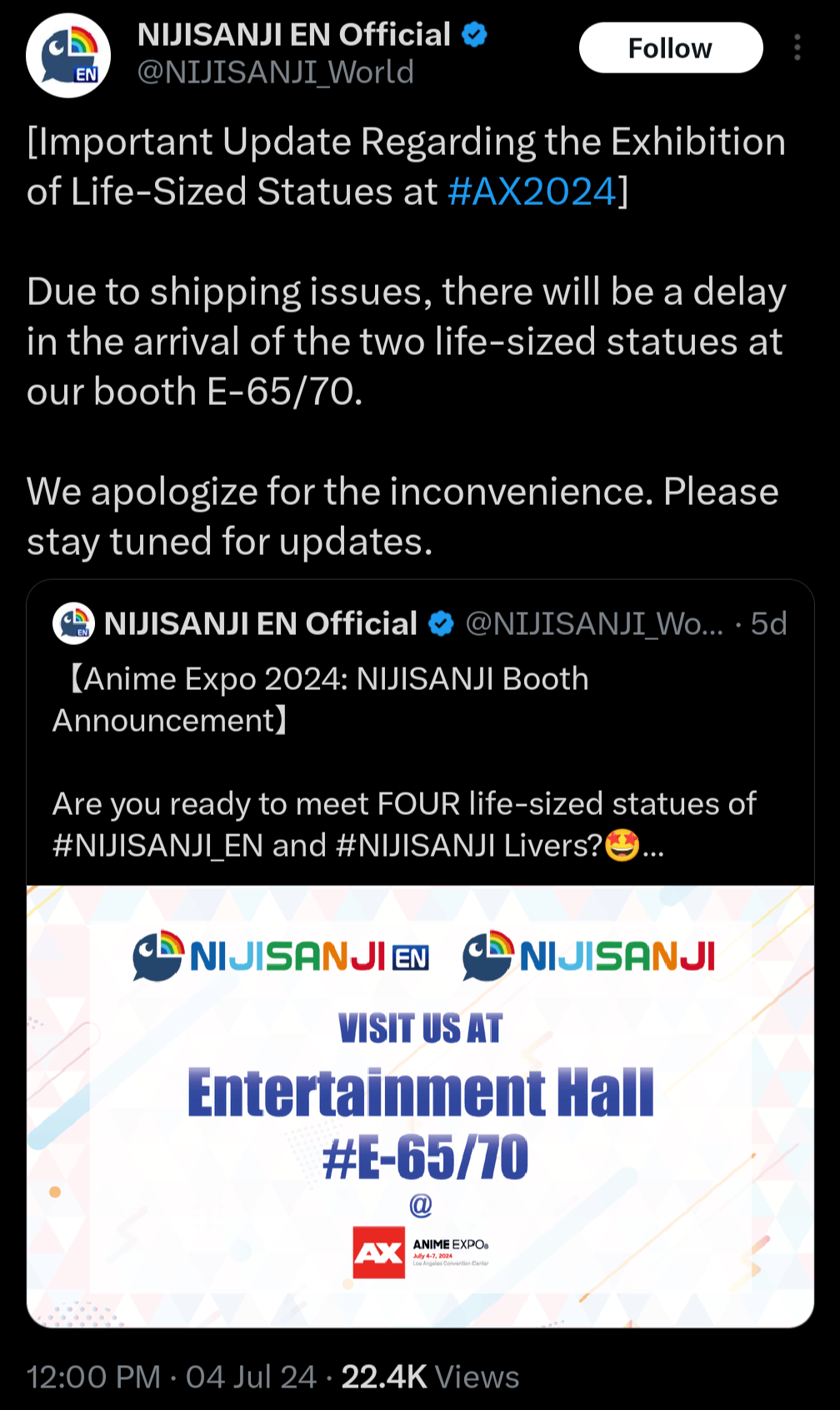 >Нинисани участвуют в АнимэЭкспо2024 >Анонсируют концерт >Неожиданно концерт отменяют >Но у нас будет стойка на выставке, там будут ростовые фигуры наших талантов, сможете подойти, сфоткаться >Фигуры не приедут.