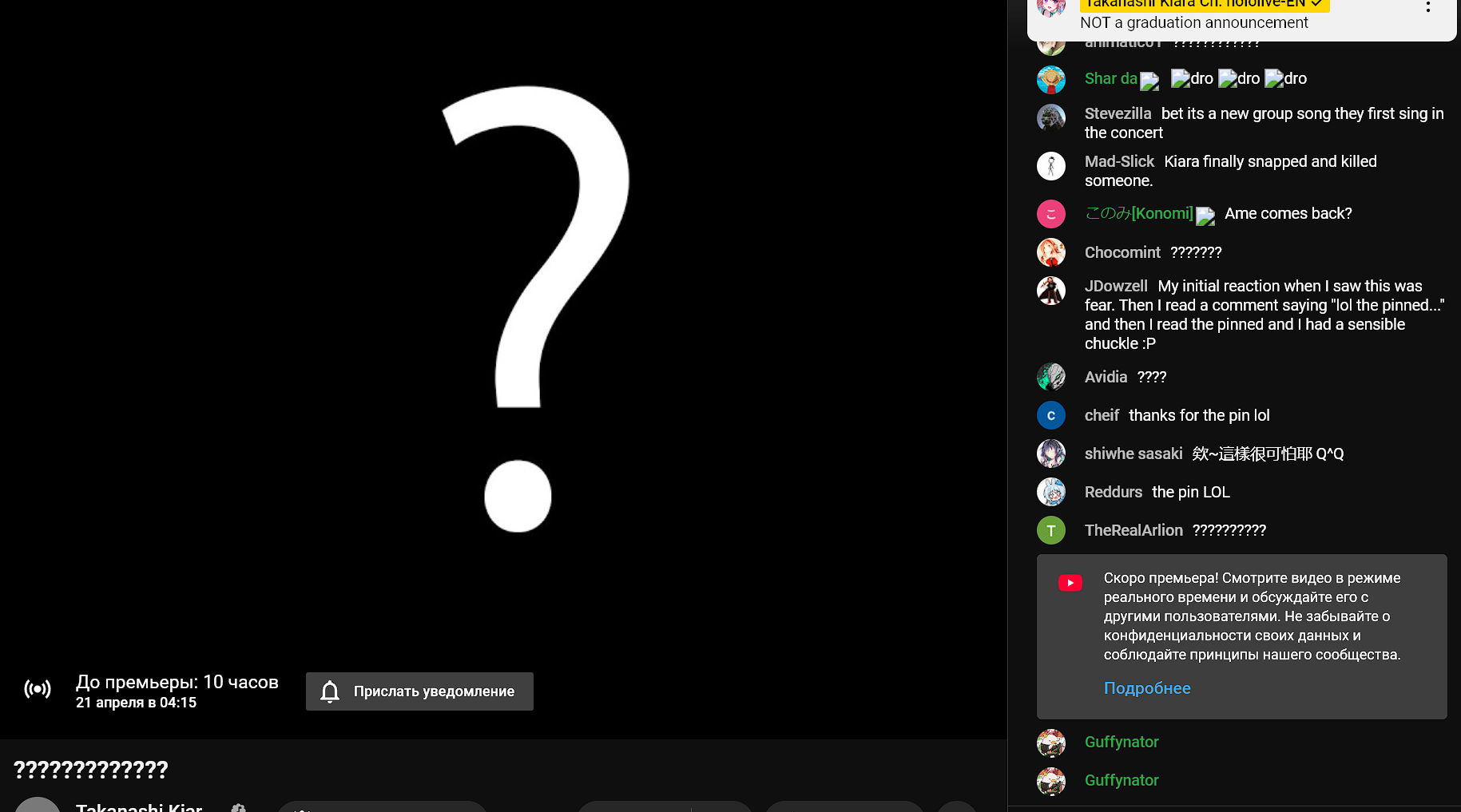 > Я супер-устал за вчерашний день. Хотел постримить, но физически уже не смог потому что в чатах в Дискорде и Телеге происходил анал-карнавал и мы с модерами пытались это дело хоть как-то просматривать и поддерживать порядок, я не спал с пяти утра потому что именно ночью и утром была самая жесть. Еще никогда чаты настолько не полыхали лол. Но я никого не виню, само собой. Оно и понятно, уход Гуры это очень большое событие и людям нужно было выпустить свою фрустрацию. Надеюсь что хотя бы некоторым из вас разговоры помогли обрести душевное равновесие. Я только хочу сказать что мои мысли с выхода ролика не изменились. "Разногласия с менеджментом" это ОЧЕНЬ-ОЧЕНЬ-ОЧЕНЬ гибкая формулировка. Это не одна какая-то причина, это множество индивидуальных вещей, о которых девчонки, ввиду самой природы витубинга, рассказать не могут. Опять-таки, уход Гуры сюрпризом ни для кого не был. Уход Мумей не удивил тех кто долго за ней следил. Уход Шион тоже не сюрприз. У девчонок довольно индивидуальные случаи и, зачастую, личные причины. Вот вам женщина-краб в подтверждение: https://www.youtube.com/watch?v=pIrSHtHnRE0
