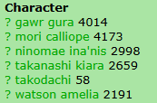К слову про трахать, вчера как-то гулял по просторам рул34, внезапно заинтересовался кто там самая популярная чуба. По краткому исследованию выяснилось, что среди ЕНок - Мори Каллиопе, ненамного опережает Гавр Гуру. Среди японок их обгоняет только Марин-сенчо, которая и занимает почетное первое место самой надроченой (в рамках одного сайта) чубы.