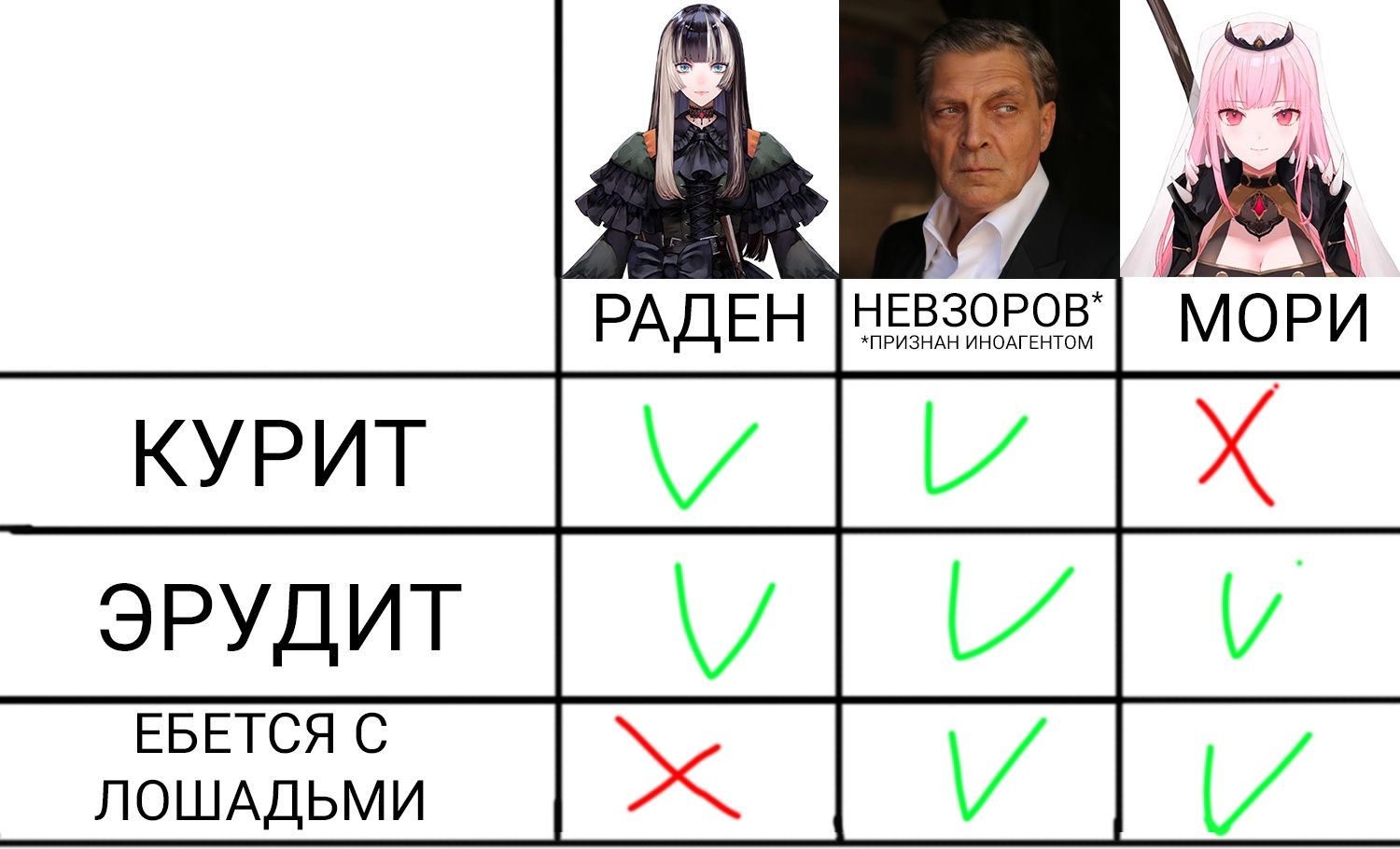 >>460709 Как смотревший жопой стрим камушка: Бавы - чисто для фансервиса и чеховского ружья в конце. Курица и Калижопа - отыгрывали Курицу и Калижопу соответственно, но вторая пыталась наводить суету, пока первая страдала хернёй. Ирис и Хорни - два ёбыря-террориста. Ина и ЕРБ - два аутиста на своей волне. Пантера - как-то выпала на фоне остального движа и в итоге натянули сову на глобус, отдав её на откуп Курице. Цесилия, Жижа, Крыса - пытались в РП, отличное от долбления в дёсны с другими девушками насколько это возможно. Можно глянуть. Нериска и Шиори - этих я благополучно проебал, хотя мелькали часто, плюс вроде Жижа вытянула Шиори на полноценную ДРАМУ. Биба - это для сильных духом. Отыгрыш раздражающей пиздючки в квадрате, уровень петросянства и кринжа порой улетал в закат я ни о чем не жалею.