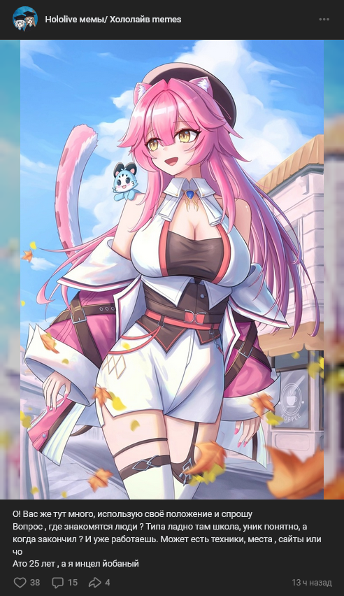 >>459990 >Как я понял из содержания + контекста, это должен был быть лучший нот-лайв перформанс Холо Нет? Ну серьёзно, с какого хуя ты это взял? Акула попросила коллаб с известными людьми, уверенная что ей откажут, ей разрешили, композитор поспрашивал какие эмоции она хочет в песню вложить, она рассказала, он текст написал и музыку сделал, под это другой известный чел клип нарисовал. На каком этапе кто-то из них внезапно должен был решить, что это самая важная работа в холо и надо прям разъебать все чарты, расскажи-ка подробнее? Они там вообще такими категориями не мыслят, ты слишком долго с двачерами в одном помещении просидел и у тебя соображалка не с той стороны сгнила. >>459993 Это тоже, кстати. Песня должна была быть несколько "личной", нравящейся не всем, но придерживающейся определённой планки и западающей в душу некоторым из фанатов — так она таковой и является. С поставленными задачами все справились отлично, просто кое-кто эти задачи даже близко понять не смог.