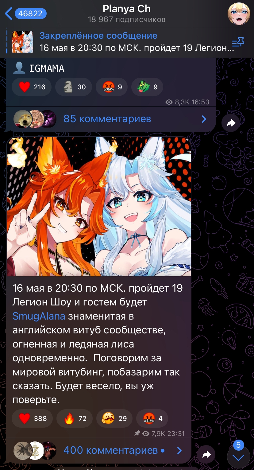 Закрыл гештальт солидарности. Посмотрел ночью третий стрим нового костюма гомостарсов, из-за чего чуть не проспал на работу, и вот чего не понял. Какой там вообще положняк? Я посмотрел Акселя, Региса и Гависа. Если покопаться в воспоминаниях, про первого я что то слышал, второй вроде бы активно подсасывался к тянучкам около года назад, а третий вообще хуй знает кто, но стрим у него был самым интересным, а онлайн, кажется, самым большим да и вообще это единственный из трёх, кто не говорил таким голосом, будто ему эрегированный член в тисках сжали. Пойду Крони смотреть, хули.