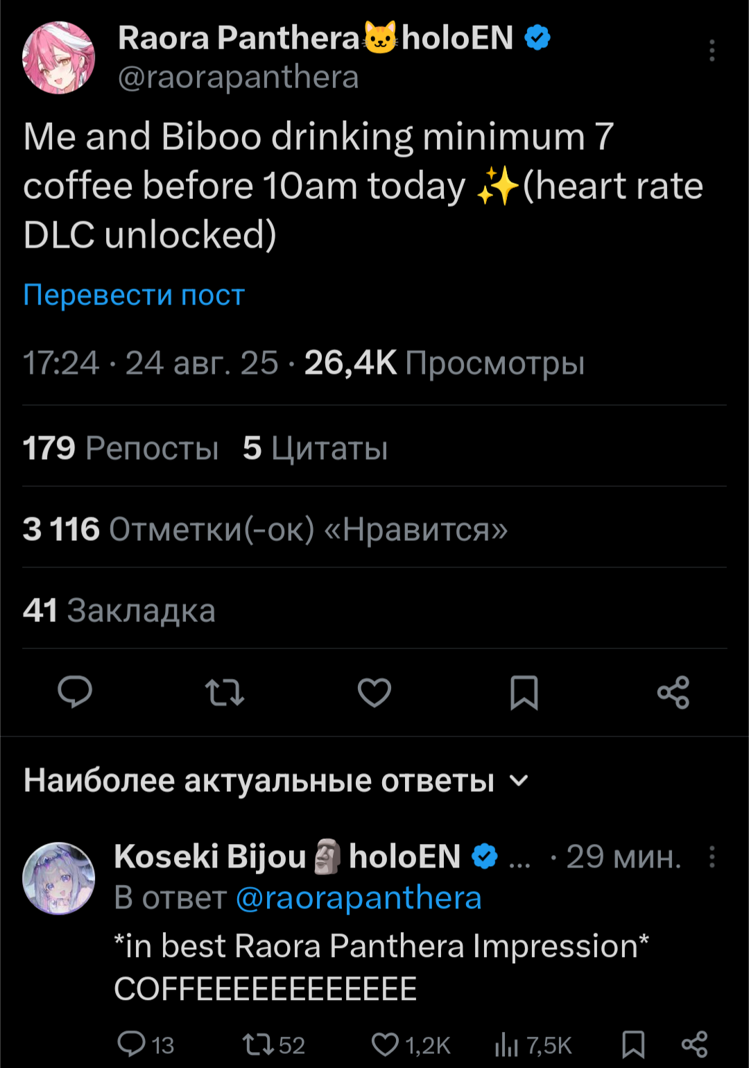 >>475028 Нерисса включила режим стервы и выбила себе скрытый отпуск после длительной японской арки, была слишком занята семьёй и племяшами с сёстрами, после концерта вернётся в строй, уже обещаны игровые коллабы с Шиори, кажись будут House of Ashes играть. >Честно скажу, хуй знает, зачем джейлберды смотрят её. Мы смотрим её не из-за игорей, это уж точно, для игродаунов есть Бибуу и прочие, нам просто нравится слушать её истории и тирады про всё подряд. Конечно твиттер спейс или комьюнити пост от неё не помешал бы на этой недели, а то совсем нет никакого хайпа по AFO концерту, а у неё сегодня ещё и Ворлд Тур а Нью Йорке. Вот вам мои безумные умения.