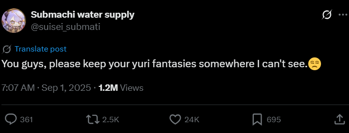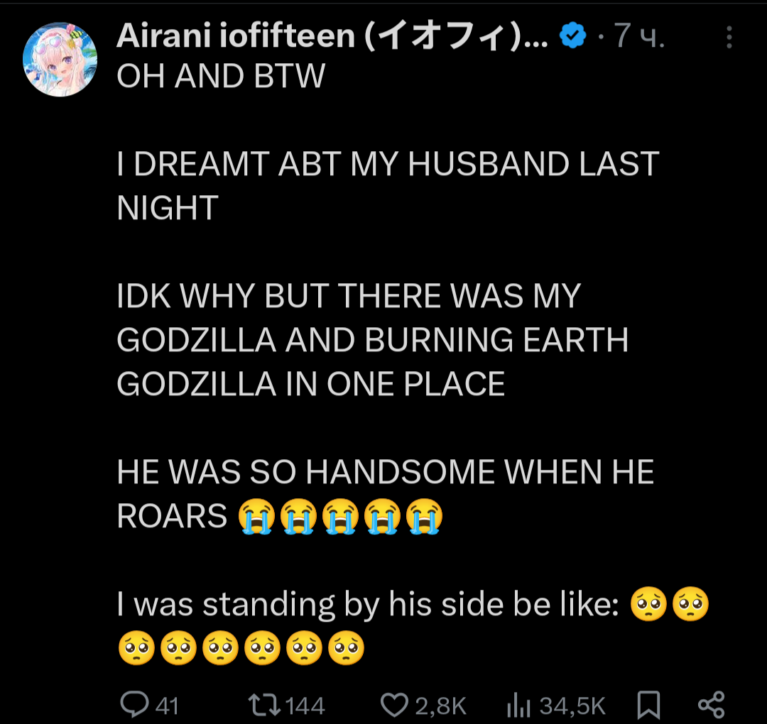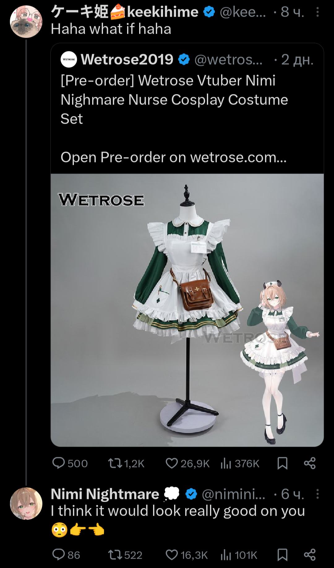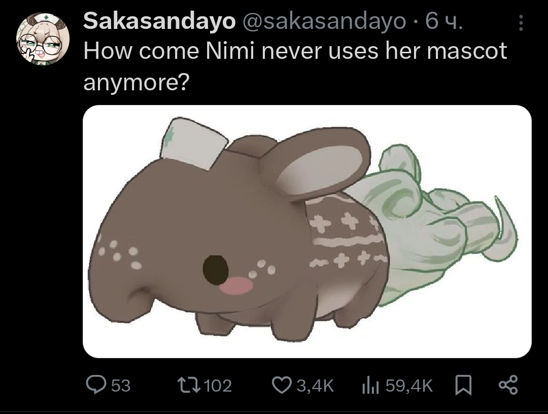>>476887 Нет, но это вызвало щитшторм среди единорогов, которые начали обвинять Нериссу в том, что она продвигает Старсов и будет следующая с ними колабиться, особенно на форчане, поэтому и пришлось вмешаться и успокаивать. А вообще я нахожу кринжем, когда кто-то твитит полученные лайки от талантов.