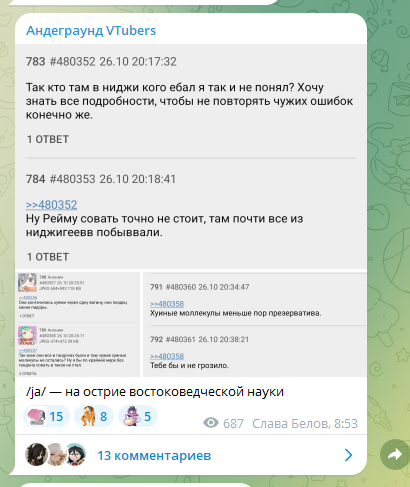 Нет, лютейшая самоцензура от обиженных кумеров-симпов. 70% разговоров про то как бы они залили спермой всё внутренности вставить_название чубы/какие они одинокие обиженные чуханы Еще 20% всякие говно анонсы. И 10% действительно то самое обсуждение. И негативное мнение почему-то долго не живет. ИНТЕРЕСНО ПОЧЕМУ ЖЕ ТАК? Да уж лучше на Реддите/Твиттере сидеть.