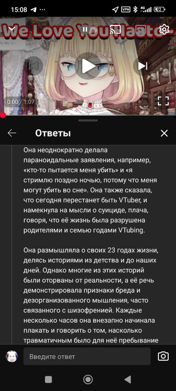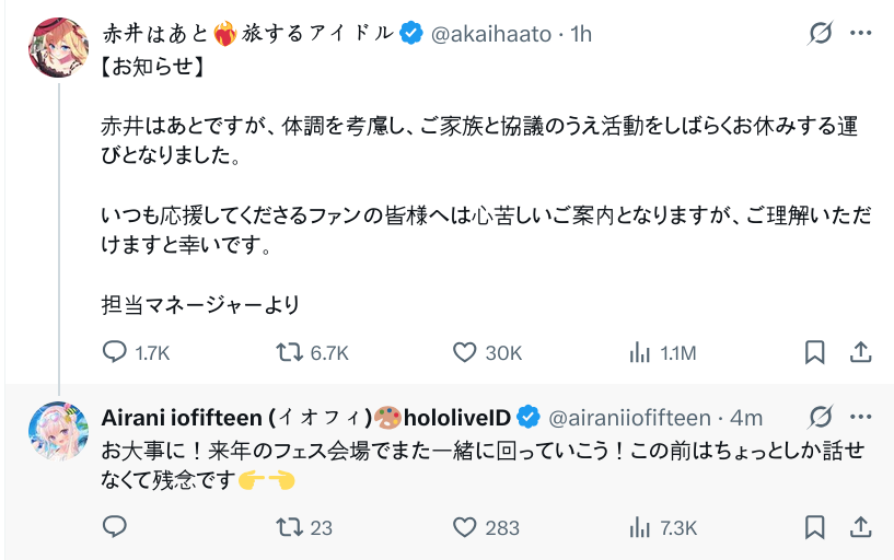 СРОЧНЫЕ НОВОСТИ: Представители Hololive официально сообщили о скоропостижной смерти айдола Akai Haato, известной также под псевдонимом Hachaama. Сегодня утром ее тело было обнаружено в палате — предварительно установлено, что причиной смерти стало повешение. Предсмертная записка не найдена, а записи с камер видеонаблюдения оказались удалены. На месте происшествия работает полиция префектуры Осака, расследование продолжается. Выражаем глубочайшие соболезнования семье, друзьям и поклонникам.