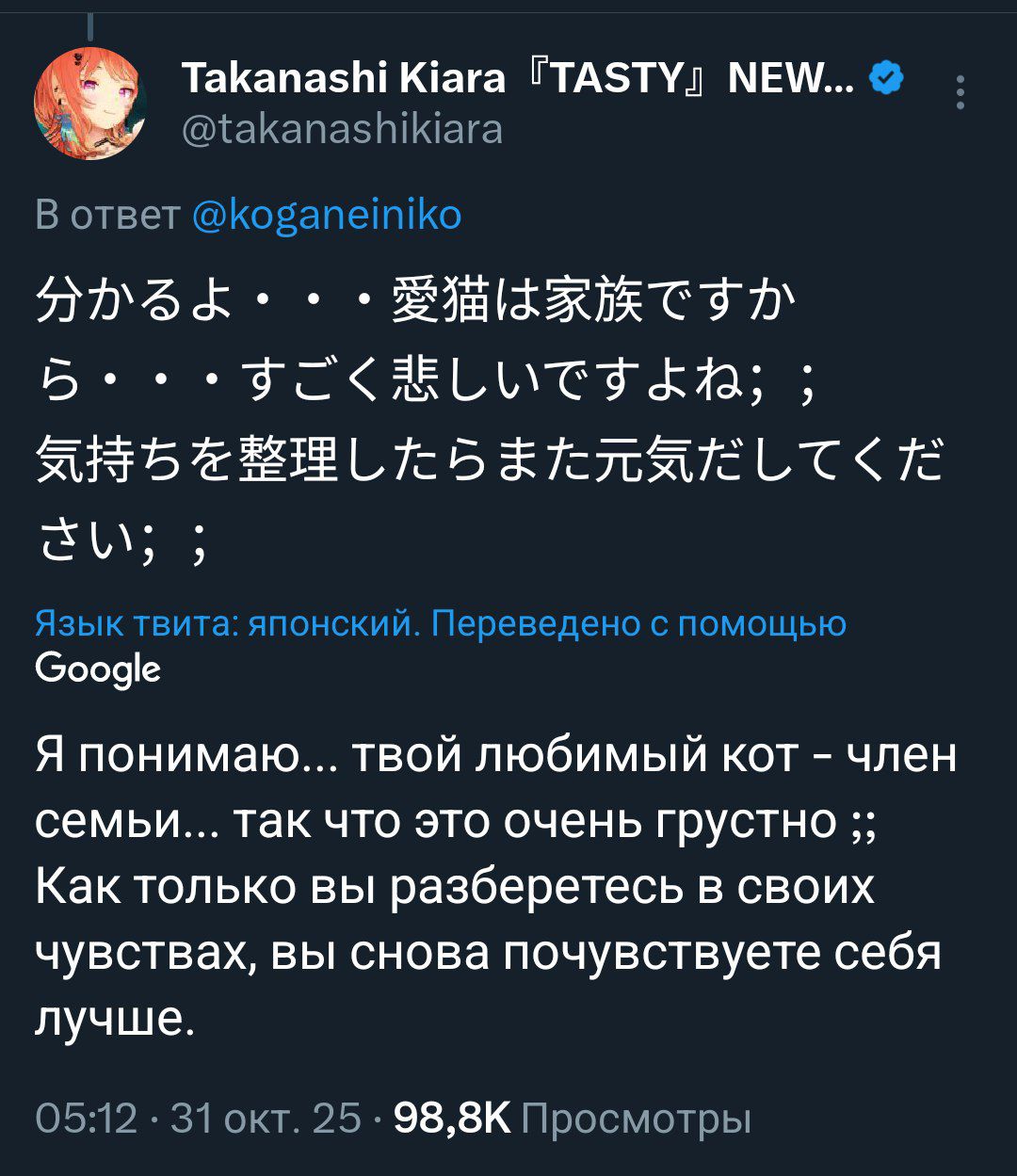 >>480758 Я хуёво знаю японский, но звучит как "когда заканчиваются те, кто был бы на твоей стороне — это страшно. Когда подобное случилось, это почти убило меня". Бля, да нет смысла вот так таскать куски и надеяться что нейрохуйня тебе что-нибудь умное скажет. Хочешь что-то реально понять — иди к человеку, который ЗНАЕТ японский и который способен выписать нормальный перевод хотя бы ключевых моментов. Верить переводчику или долбоёбам с форчка, которые точно так же гоняли эти её телеги через переводчик или вообще через своё "да я уже 10 лет анимешник и понимаю половину слов" — нахуя? Сейчас не тот момент, когда можно положиться на примерное почувствование и надеяться что ну уж толпой-то мы всё правильно поймём, а все ошибки перевода "ну там кто-нибудь поправит..."