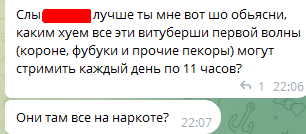 Вы лучше скажите, как так получилось, что нервный срыв был у Чамы, а кукухой поехал полотёр? Он же вроде успешный и состоявшийся человек по меркам двача, вроде ещё месяц назад постил выжимки из стримов Риссы, вяло перекидывался с куроёбом, а тут резко мутировал в агродебила.