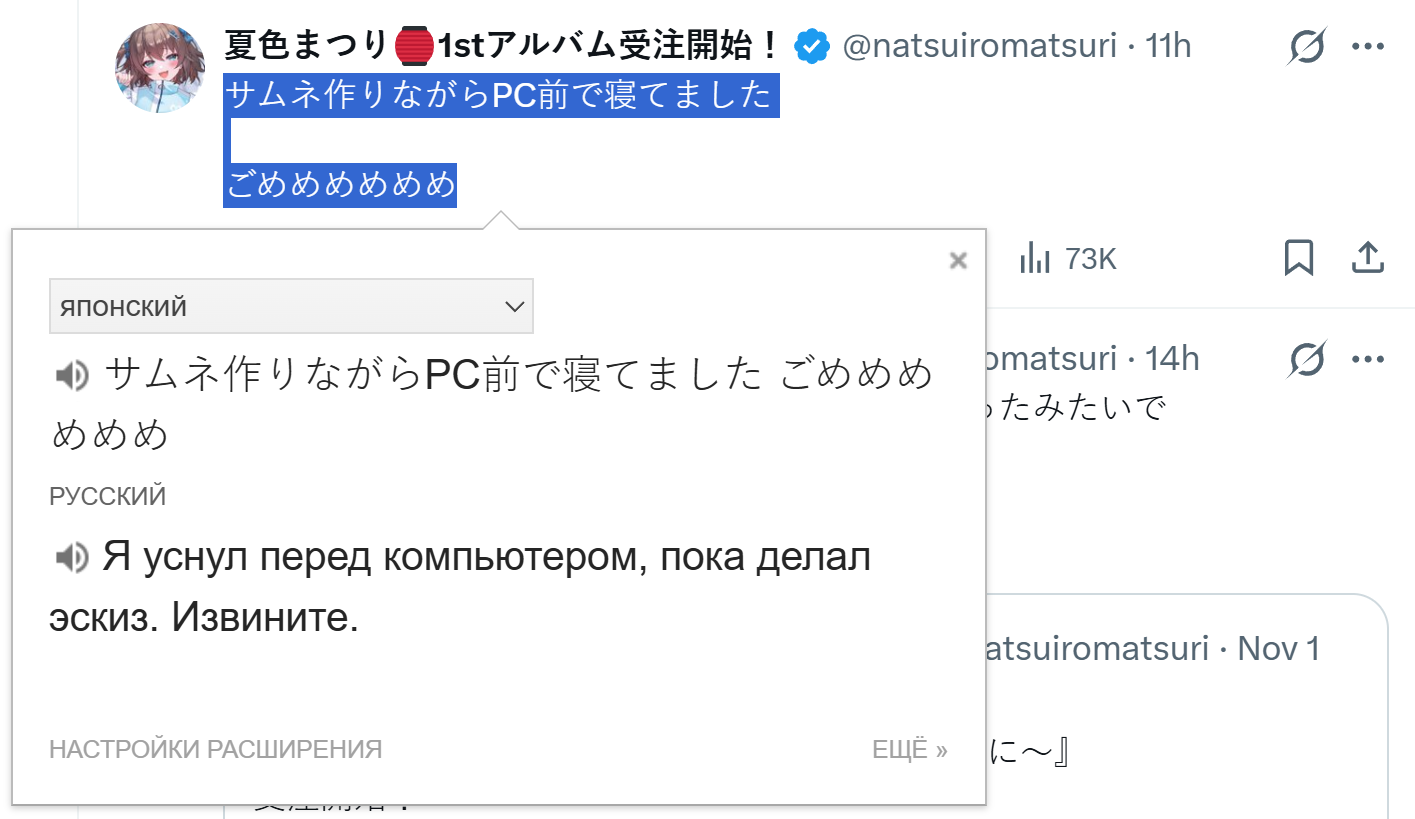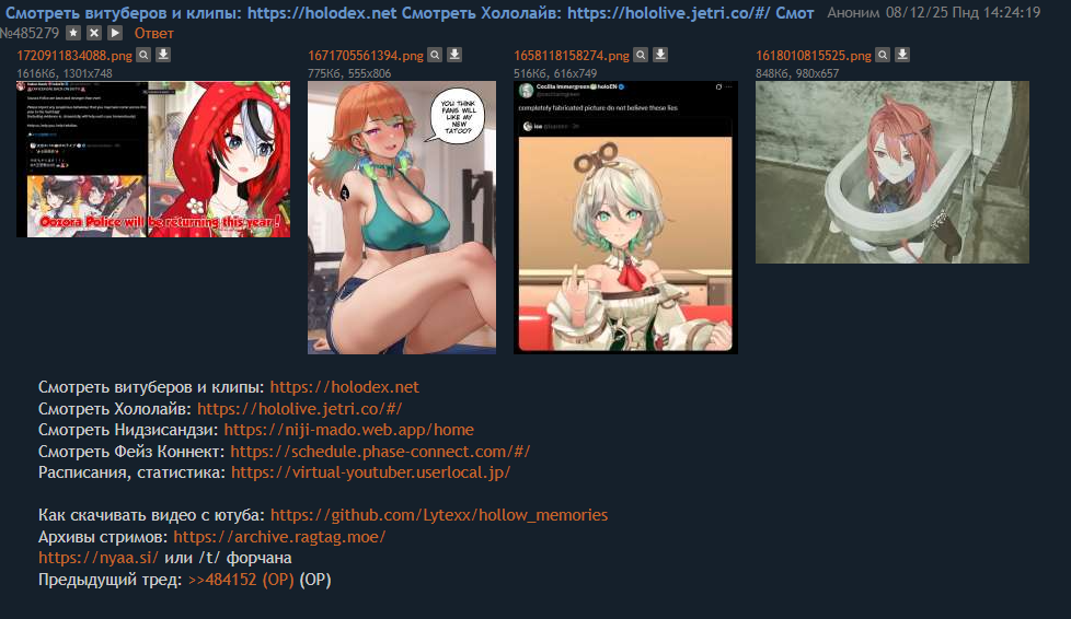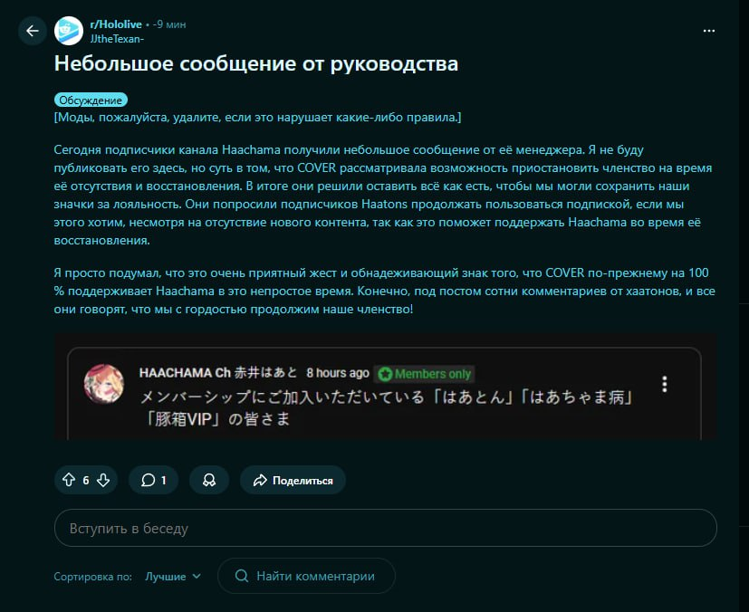 Удаление изображений с её участием и снятие подписки с неё не связаны с вышеупомянутым вопросом. Эти действия были предприняты мной после её публикации в соцсетях 20 сентября 2025 года — чтобы избежать возможных недоразумений относительно моего участия как создателя изображений её персонажа. Однако объяснить это публично я тогда не мог из-за закрытого характера взаимодействия между таланткой (госпожой Итидзё Ририка) и Cover Corporation, и из уважения к ним воздержался от комментариев.