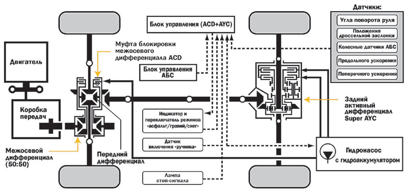 How AYC Works The AYC differential actively splits torque between the right and left rear wheels, effectively changing the yaw moment of the vehicle as needed for a given cornering situation. Like ACD, AYC is controlled by the S-AWC computer, using inputs from steering wheel angle, throttle opening, individual wheel speeds, and longitudinal and lateral movements.