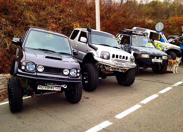 Гораздо больше города Жымни любит грунтовки и говна. На грунтовках можно гонять кроссовые мотоциклы и квадроциклы, унижать пузотёркоблядей во всех позах и не отставать от куда более дорогих лапников. Сразу скажу, что это применимо к хотя бы по минимуму лифтованному Жымни. Стоковая подвеска дубовая и ебаная. Видимо сделана для асфальта. По минимуму нужно хотя бы менять пружины и амморты. Эффект разительный. Вариантов лифта на джимни ояебу сколько. От 1 дюйма до 6 только пружинами. Ещё дюйм - два можно выкроить проставками под кузов. Под задратый жымни сразу хочется диски пошире. Тут тоже ассортимент хороший. Самые отважные берут диски -20/-40 (сток +23) и добавляют к ним проставки 3 см. Но тут потребуется усиленное внимание к подшипникам. У знакомого с таким конфигом их хватило на 15к жестких продубасов. Раздатка у машин после 05 года электронная, 3 кнопки в салоне. Её сразу требуется закрыть хорошей защитой, провода датчиков отрываются на раз-два. Для хардкора её свапают на классическую механическую раздатку от предыдущего поколения Жымни. Плюс в том, что на неё выпускаются дохуя понижающих китов. Выбор локов тоже хороший. Пневма от АРБ (50-60), пнемпа от китайцев(20), хардкорный локрайт(10) и русский лсд НИРФИ(15).