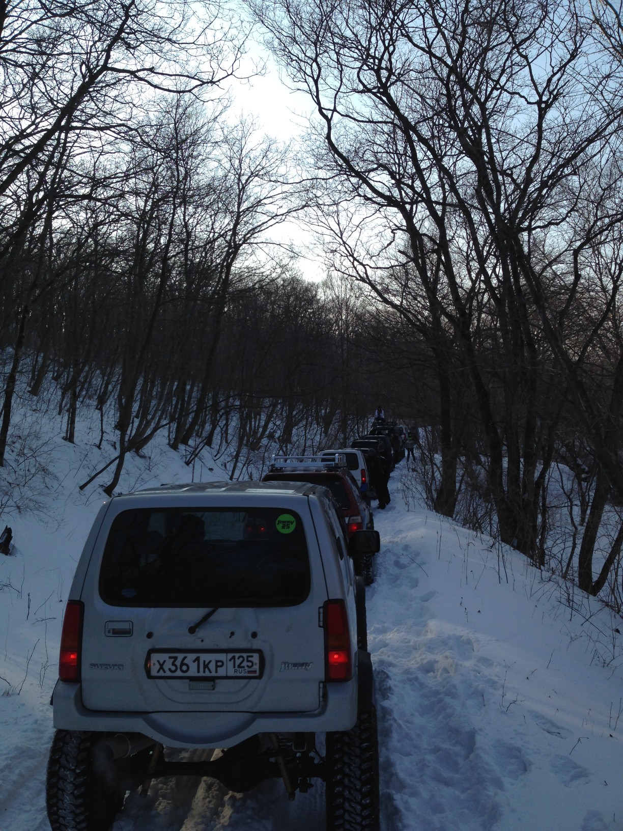 Немного покатались по винтер трейл маршруту толпой. Организовали пробку в лесу. Ехали по дороге вокруг холма, с одной стороны пёрли нормально, подъехали в другому склону и привет, снега выше пояса. Походу ветром всё туда надувало. Превозмогать сквозь ночь желающих не нашлось поэтому было решено развернуться и признать себе кофеечными оффроадерами. Пару джимов стащило в кюветы, первого вытащили весом своих тел, а второй лебедился.