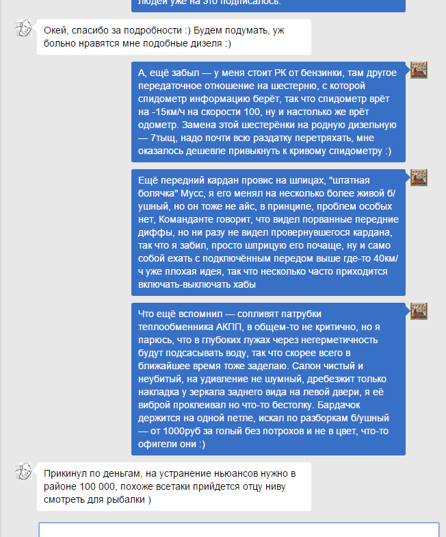 >>18521 Продаётся Муссо. Использовался для дальних поездок. Состояние хорошее. Все основные узлы в норме, движок отлично заводится на горячую и на холодную, ничего не ест, ничем не дымит, коробка переключает, рама проварена и заантикорена, даже кондей живой и работает, в багажнике смонтирована спальная полка с рундуком. Могу дать ссылку на блог этой машины на Драйв2. Обслуживалась в клубном сервисе SC Comandante. Подробно покажу все мелкие недостатки. Вынужден продавать по причине покупки недвижимости. Нахер никому не сдалось твое неспешно. Ты же не долбоеб, продаешь или нет? И сленга поменьше, ты не с кентами обсуждаешь анусы. Про состояние тоже не надо вдаваться, напиши просто, что ты поменял и исправил.