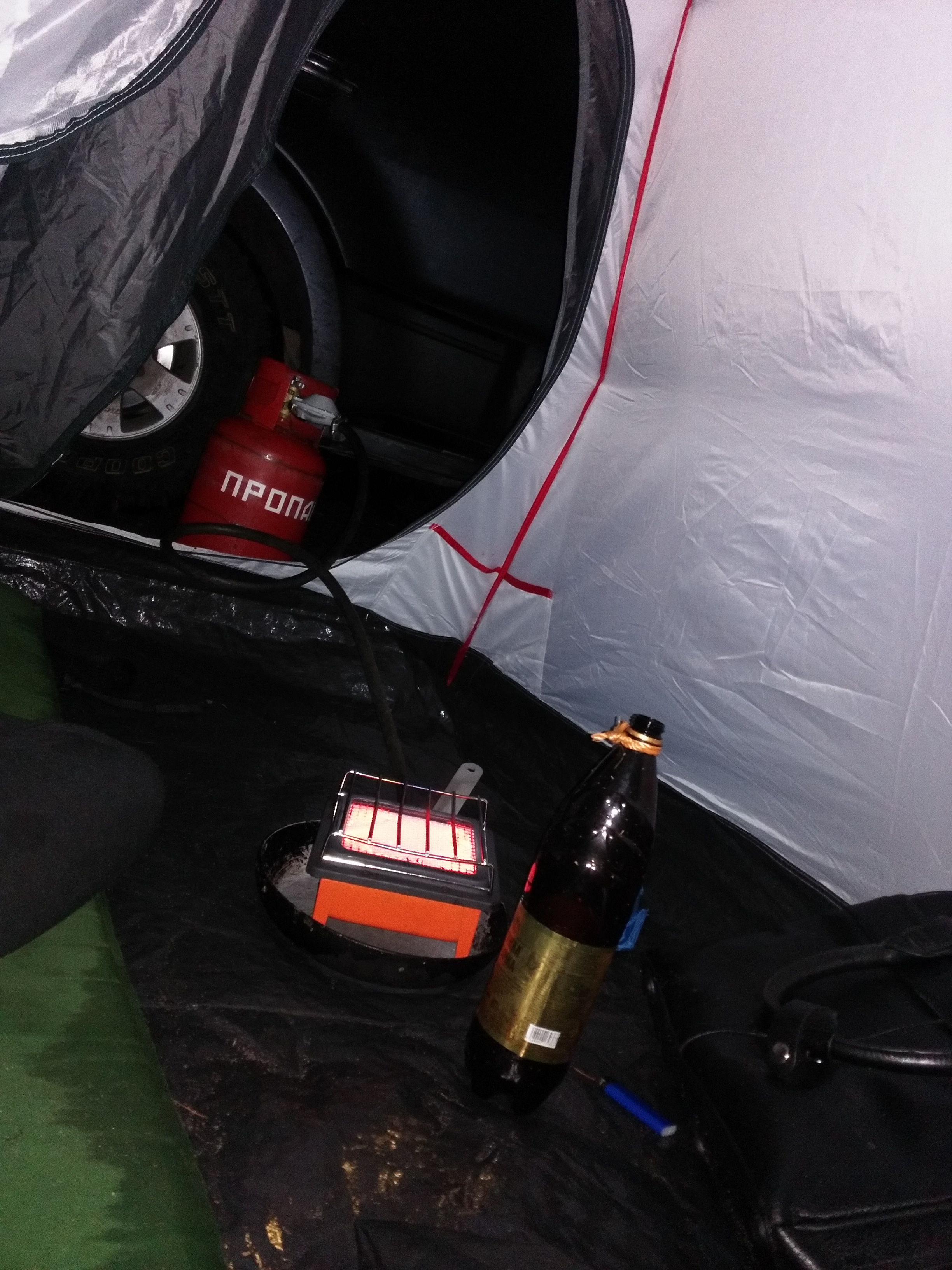 >У тебя палатка диван сколько кубов? 20? У меня есть палатка в которой даже поболее будет. Основание у неё крестом не менее 12 квадратов, и в высоту она метра 2, под 30 кубов будет наверное. Сплю там обычно на раскладушке, можно газом топить смело, стол поставить и тд. Места там человек на 6, если занимать вообще все место на полу то 10 влезет наверное.