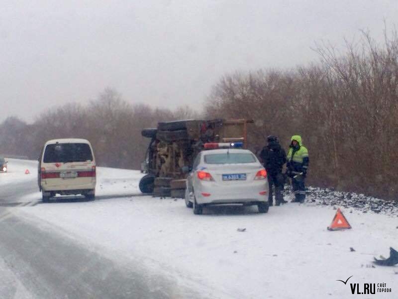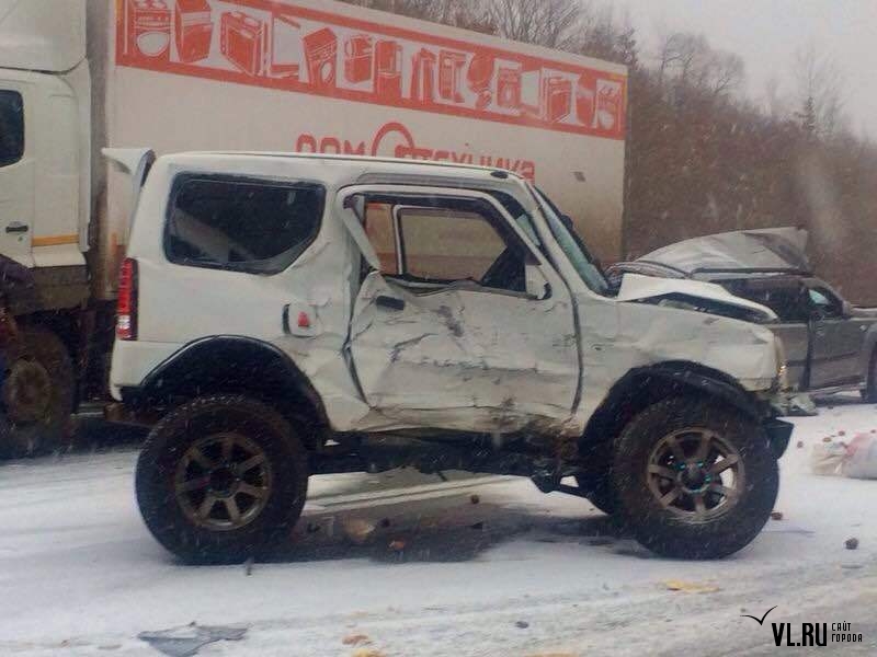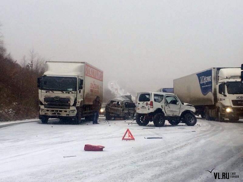 На этом же участке трассы произошло еще одно ДТП с участием грузовика-"бабочки" и внедорожника. Водитель X-Trail, двигавшийся на высокой скорости со стороны Уссурийска, заметив аварию, попытался затормозить. На скользкой дороге автомобиль занесло и отбросило на объезжавший уже побитые машины Hino. От удара на месте погибли водитель и пассажирка X-Trail. Ребенка, сидевшего на заднем сидении, прибывшие медики забрали для оказания медицинской помощи.