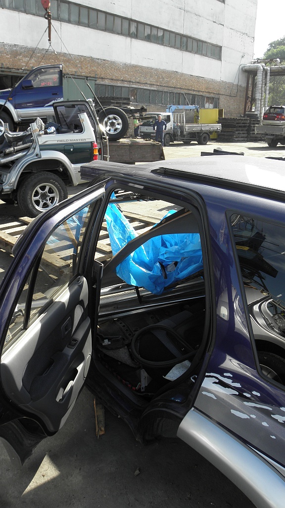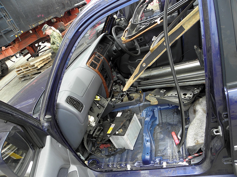Встречали мы его в порту по собственной инициативе дабы ушлые пидорасы ничего не спиздили. Как оказалось всё равно спиздили крышки на туманках и аккумулятор. На фото салона можно видеть пил по полу. После выпуска погрузили и увезли не подумав, что после вывоза претензии по поводу спизженного не принимаются. Ну хуй с ним.