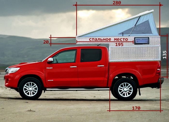 Москвич Артём Чечкенёв сам строит жилой модуль на базе Toyota Hilux и подробно описывает весь процесс, включая возникающие сложности и способы их преодоления. Модуль алюминиевый. Расчетный общий вес около 130 кг.