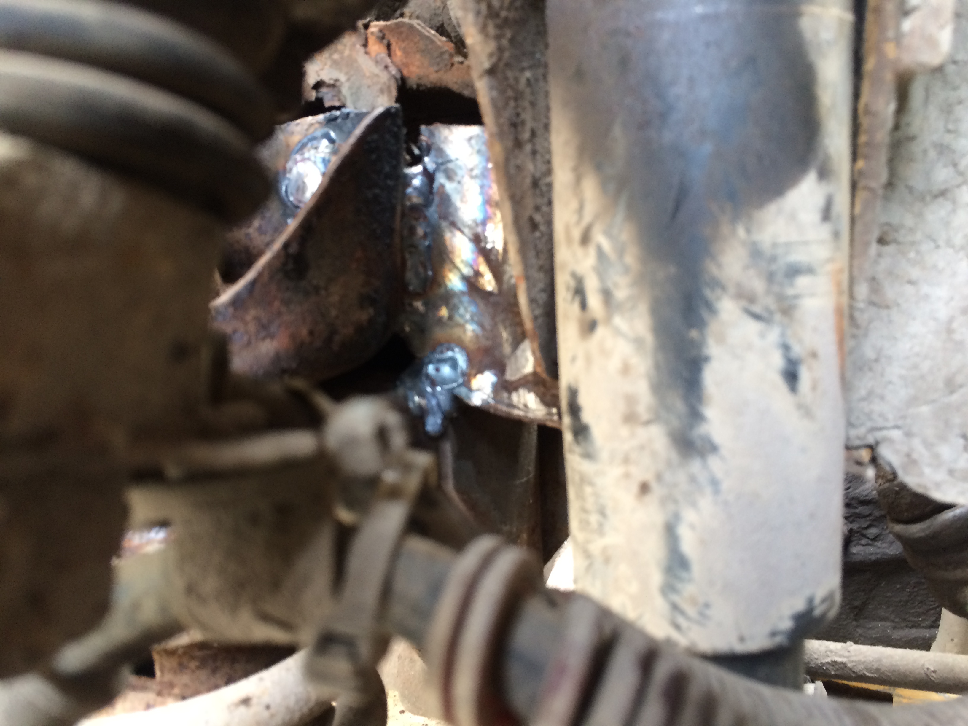 так-так-так, штоета тут у нас? паперечена, ахахахах! паперечена атвалилась! ахахахах! короче забыл сфоткать перед началом работ, поперечина, на которой ютятся амортизаторы и опора тяги панара, решила что ей не место на ниве и порвавшить почти пополам висела в 5 см от пола. заодно порвался к чертям весь пол багажника и даже частично под баком. я сделал пропил вдоль одной стенки поперечины, воткнул уголок и приварил к своей поперечине, что я пару недель назад приварил в самом багажнике. долго поебавшись с резьбой по калу, усилив опору тяги панара, я решил что ниве надо организовать проушину. нашел круг где-то 25мм, приварил к уголку и усилил на изгиб профилями 20х40. збс вышло!