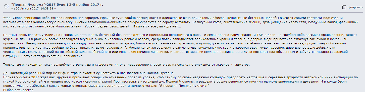 >>46514 Как то странно осознавать, что вся движуха на внедорожниках, взлетевшая в пик 2014 (когда один за другим открывались аффрроад-шопы, какие - то кустари с силовиками и спальниками и прочая ИНДУСТРИЯ) и как-то барахтающаяся сейчас - просто очередное увлечение офисных крыс. Просто часть из них чухнула, что обхуячиваться водкой в лесу или на пляже - разницы нет, зато далеко не всякая жена поедет в "экспедицию" в отличии от Турции. Ну а мочалки и миндели смекнули что если втирать про березы и духовность - то это ещё и продать можно.