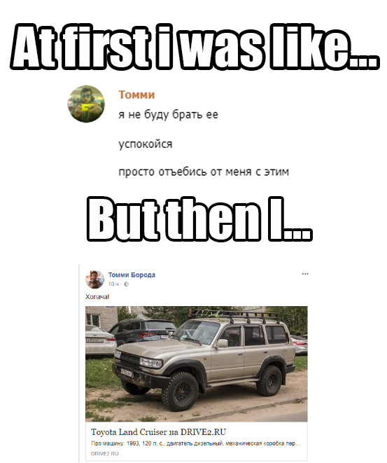 Посмотрел сегодня один Прадик, прокатился. 2008 год, 4 литра, один хозяин по птс, 180к пробег. Ну,тащемта, понравилось. Сидишь высоко, в салоне места много,динамика вообще огонь после нивы то,лол Но блять... 2008 год, а магнитола будто из 90х, с кассетной декой блять, выглядит как говно. И с приборкой та же хуйня. У дядьки икс трейл 2007 года, так у него приборка интереснее смотрится. В четверг ещё Вранглер буду смотреть, чисто для успокоения души