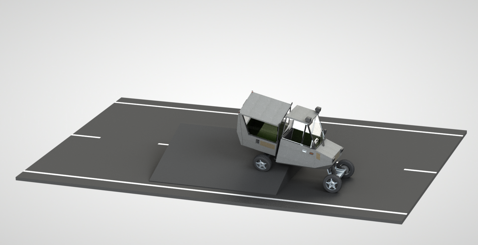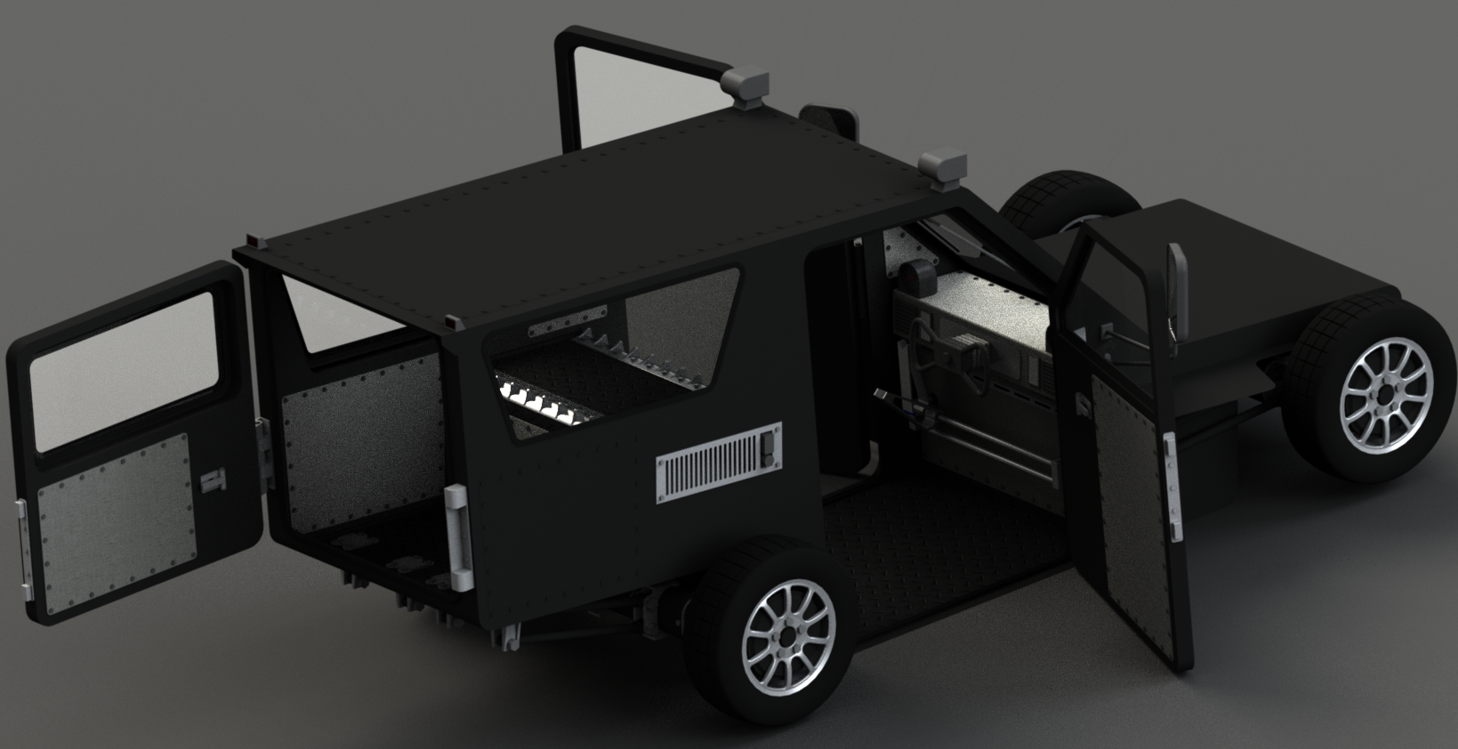 Силовая установка -- 12 кВт мотор-ступицы, полный привод. Маленький аккумулятор на 20 км и 15 кВт бензоген с бензобаком. Рулит шаговым электродвигателем.