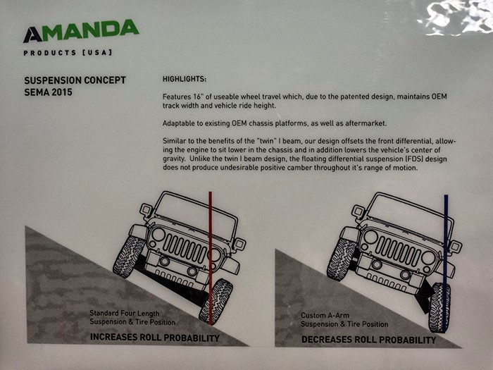 Американская компания Amanda Products представила революционную концепцию передней и задней независимых подвесок для внедорожников. Идея была продемонстрирована на Jeep JK Wrangler, но разработчики уверяют, что такое может быть реализовано и на других моделях. В отличии от конструкций на основе двутавровых балок плавающая дифференциальная подвеска (FDS - floating differential suspension) позволяет избегать чрезмерного бокового наклона автомобиля и понижает центр тяжести. Ход передней независимой подвески - 16 дюймов (40 см). Ход задней подвески FDS – 14 дюймов. Центральная часть мостов 9-дюймовая Фордовская.
