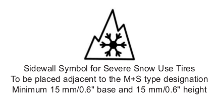 >Passenger and light truck (LT) tires meeting the following criteria are labeled on at least one sidewall with the letters "M" and "S" (e.g., MS, M/S, M&S, M+S, etc.). >These tires have been designed to provide better starting, stopping, and driving performance in snow conditions than non-M&S tires, and have the following general characteristics: >1. New Tire treads shall have multiple pockets or slots in at least one tread edge that meet the following requirements based on mold dimensions: >a. Extend toward the tread center at least 1/2 inch from the footprint edge, measured perpendicularly to the tread centerline. >b. A mimimum cross-sectional width of 1/16 inch. >c. Edges of pockets or slots at angles between 35 and 90 degrees from the direction of travel. >2. The new tire tread contact surface void area will be a minimum of 25% based on mold dimensions.