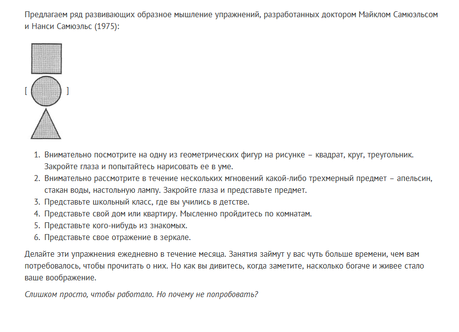 А теперь повторяйте то же самое для всего фото, каждый раз добавляя всё больше и больше деталей. В конечном счёте вы с лёгкостью сможеет визуализировать всё изображение. На это первое фото у вас может уйти вплоть до двух или трёх месяцев. Это нормально. После этого найдите новое фото и проделайте с ним то же самое. Вам будет намного проще, чем с первым. Ваш мозг уже научится изучать и визуализировать несколько предметов за раз. Вы не только сможете лучше представлять объекты, но и ваша визуальная память возрастёт экспоненциально.