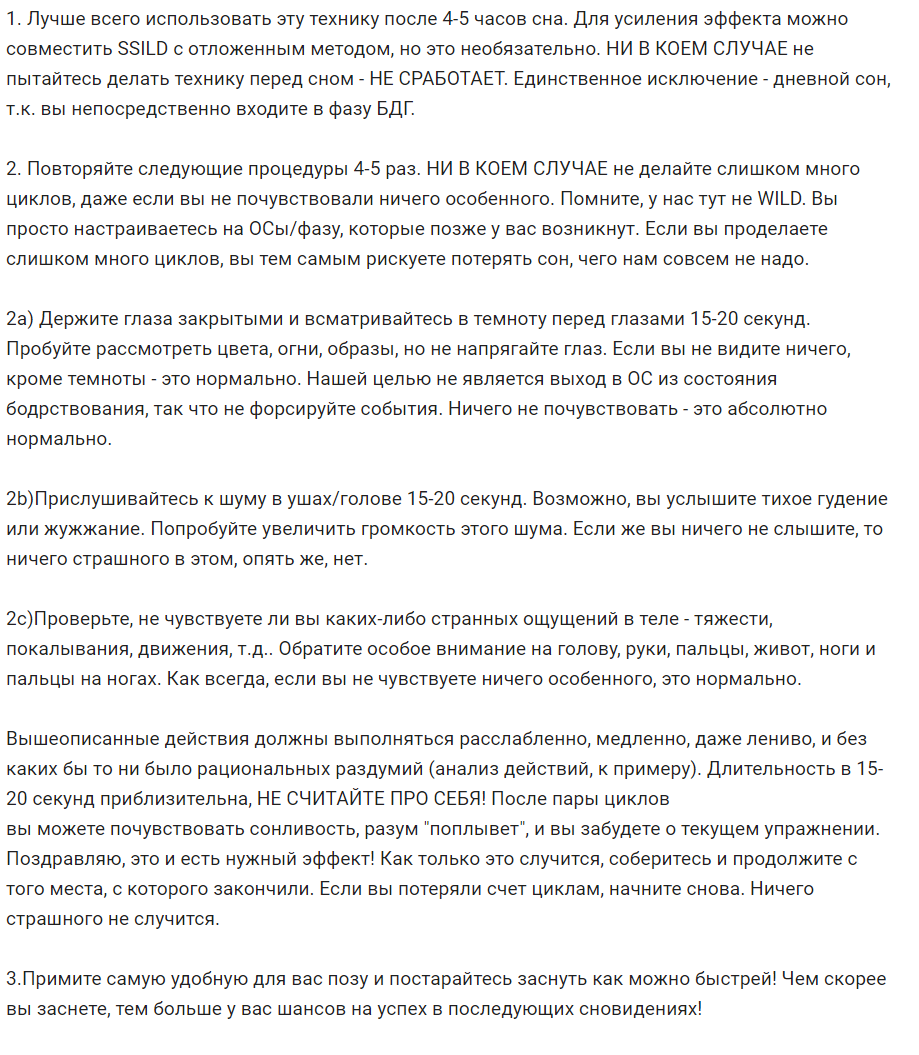 Когда будишь себя по будильнику в середине ночи, 1 раз делаешь эти 4-5 циклов перебора органов чувств и дальше засыпаешь как обычно и надеешься, что либо осознаешься во сне, либо словишь ложное пробуждение.