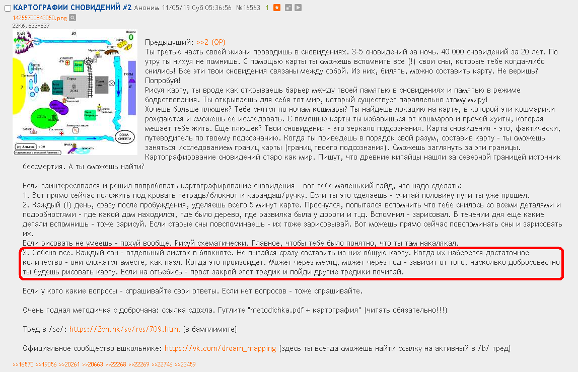 Теперь же, что касается твоей проблемы - сны по утрам не можешь вспомнить. Картография - это та самая волшебная таблетка. Я вот сча тут за принцип пытался пояснить, пасту накатал про подсознание, про структуры в подсознании, про то что ты на самом деле не рисуешь карту какого-то параллельного мира с волшебными единорогами, а рисуешь карту своего подсознания... потом стер к хуям и лучше попроще объясню. В сновидениях у тебя всего несколько десятков локаций. Каждая твоя зарисовка - это как закладка в книжке. Когда ты утром ничего вспомнить не можешь - ты берешь и пробегаешься по этим закладкам (просматриваешь свои зарисовки, максимум по 5-10 секунд на каждую тратишь). Если у тебя есть закладка с локацией, которая тебе сегодня снилась - встретив эту закладку, ты на 100% будешь уверен, что тебе именно эта локация сегодня снилась. Ты не вспомнишь сон вот так сразу, а просто появится эта уверенность - где-то на границе сознания будет вертеться этот сон (как бывает слово на языке вертится, а вспомнить его не можешь). Дальше в уме просматриваешь эту локацию с разных сторон. И когда до нужной стороны добираешься - сразу весь сон вспоминаешь.