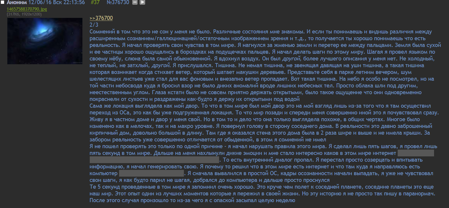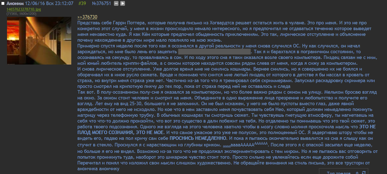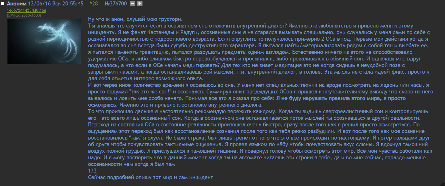 Но это не важно. Важно,что я обратил внимание на звук?! Где звук?! Когда птицы взлетают,знаете этот шум перьев?? Только задался я этим вопросом, сразу исчез. буквально упал. НЕТ. Провалился в сознание,как бы тривиально это не звучало. Шум в ушах. Наверное,слышу свою кровь. И ВНЕЗАПНО осознаю,что нахожусь в ОС,о котором однажды читал в первых нескольких главах методички от древней более развитой борд цивилизации.Помню,что мыслеформа достигла невероятной[абсолютной] свободы(абсолютную свободу здесь я понимаю,как возможность менять мироздание согласно собственной воле),но в тот же час мне было страшно не вернуться назад. Я попробовал проснуться,но сне мог... Тогда подумал: хотя бы немного эксперимента... Ещё пару картин и мыслеформ я с лёгкостью выдал. Захотелось кого-то ударить,ведь знаете,во сне удар медленный(именно об этом я и подумал тогда)... И я ударил. Лишь согласно моему желанию из ниоткуда появившийся, человек сидел за столом напротив и послушно ждал оплеухи. Прошло несколько больше времени,чем требуется,пока челюсть не была откинута далеко в сторону. И здесь я понял,пора съебывать: я не принадлежу этому месту и совершенно не понимаю,что к чему, поэтому на всякий случай лучше найти выход. (Поняли,да? Во сне, оказывается,тоже омега и ссыкло) Я попытался повторно выйти из сна,пытаясь открыть глаза. Что из этого вышло? Он решил меня наебать!! Я проснулся НА СВОЕЙ КРОВАТИ,ВСТАЛ, НО,СУКА,ЕБАНЫЙ ТЫ МУДЕНЬ,Я ЗНАЮ,ЧТО ЭТО НЕ МОЯ КОМНАТА,А СОН. По комнате метались силуеты я напрягся иии обосрался Проснулся. Такого опыта я никогда не переживал прежде. Ни-ко-гда. Сердце бешено стучало,но это,очевидно, сам себя накрутил,нежели почвенный страх. У меня нет слов,аноны,пишу это и,когда вспоминаю любой фрагмент из сна, на глазах СЛЁЗЫ,не знаю,они не от страха или выброса нейромедиаторов. На словах невозможно объяснить это ощущение,я был буквально внутри своего тела(по ощущениям совершенно в другой реальности,если так можно выразиться). Знаете,как будто пересел с высокоуровневого языка на ассемблер или вообще на машинный код и теперь не просто тыкаешь пазлы,но и сам проектируешь систему. И ощущения сооовсем другие,нежели в жизни. Ещё. Я серьёзно после пробуждения подвергнул скепсису реальность...(я знаком с идеей солипсизма,но на уровне ощущений не мог никогда представить,что окружающий мир не реален ) Боже мой.... Нынче сон кажется таким кратким,будто момент,но тогда все было настолько... Вдруг и жизнь тоже?!