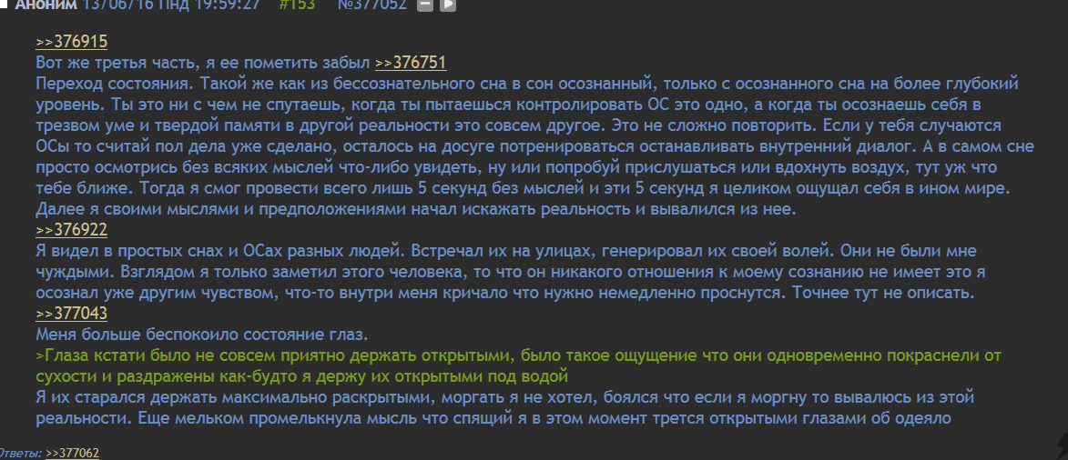 Почему я считаю мой ОС слабым? Наверное, читающий уже догадался, но я поясню целиком: видимая мною картинка не была качественной, местами будто бы было мыло; сила ощущаемых эмоций при нахождении в ОС’е — я упоминаю это, потому как в сравнении с остальными моими успешными, и даже наполовину успешными входами в ОС — этот был гораздо слабее по ощущениям; способность к действиям во сне, такие как визуализация или действия, по ощущениям были какими-то ослабленными; не убираемый конденсат «на глазах».