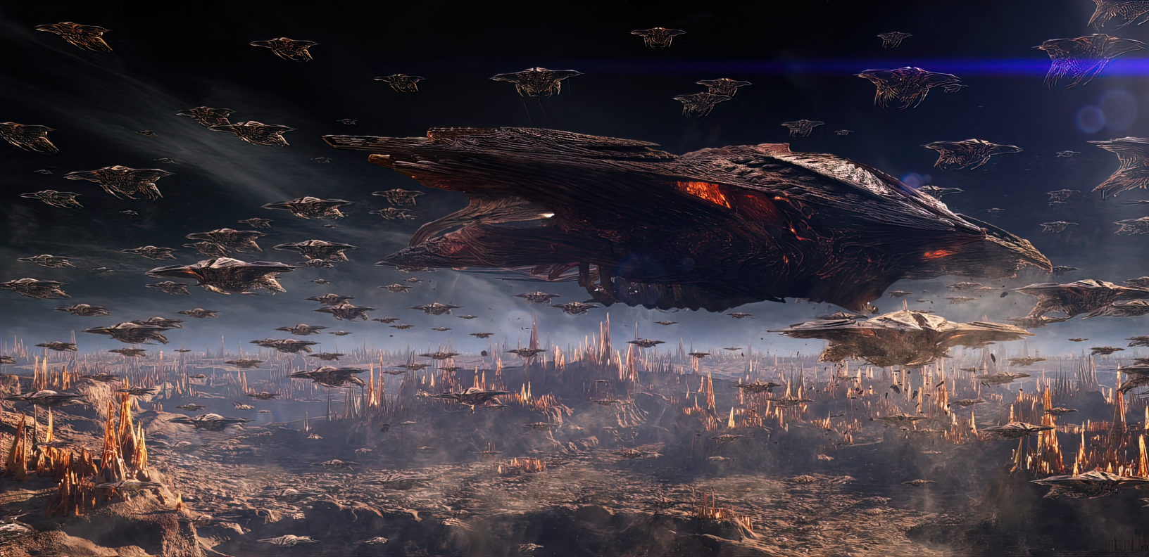 Сцена 1. Группа случайных людей. Будто внутренняя часть космического корабля, просторное помещение со стенами и потолком в форме и цветах хаотичного пузыря. Вход в комнату всего один - через крупную портальную арку. В фантастической комнате окно занимает всю стену и даже часть потолка, а за окном вид на... Какое-то соединение яркого цветастого космоса, духовного мира/варпа, осколков каменистых земель и лавово-ртутных рек. Визуально кажется, будто это вид на планету, но ты отчетливо ощущаешь, что масштабы этой локации запредельные - это космос, но только чужой и имеющий такую форму. Мы видим, как сквозь этот космос пролетает титанических размеров космический корабль. Корабль-мир, несущий на себе целые цивилизации. Мы поражены этим видом, но дальше появляется еще один такой же корабль. И еще один. Группа кораблей, рой кораблей, тьма кораблей всех форм и размеров. А за ними, по горам и рекам, идут единичные Титаны - полуживые существа из камня, каждый размером с десятки кораблей-миров. Цивилизация за гранью нашего понимания, цивилизация вечности, цивилизация, вышедшая за пределы материального мира.