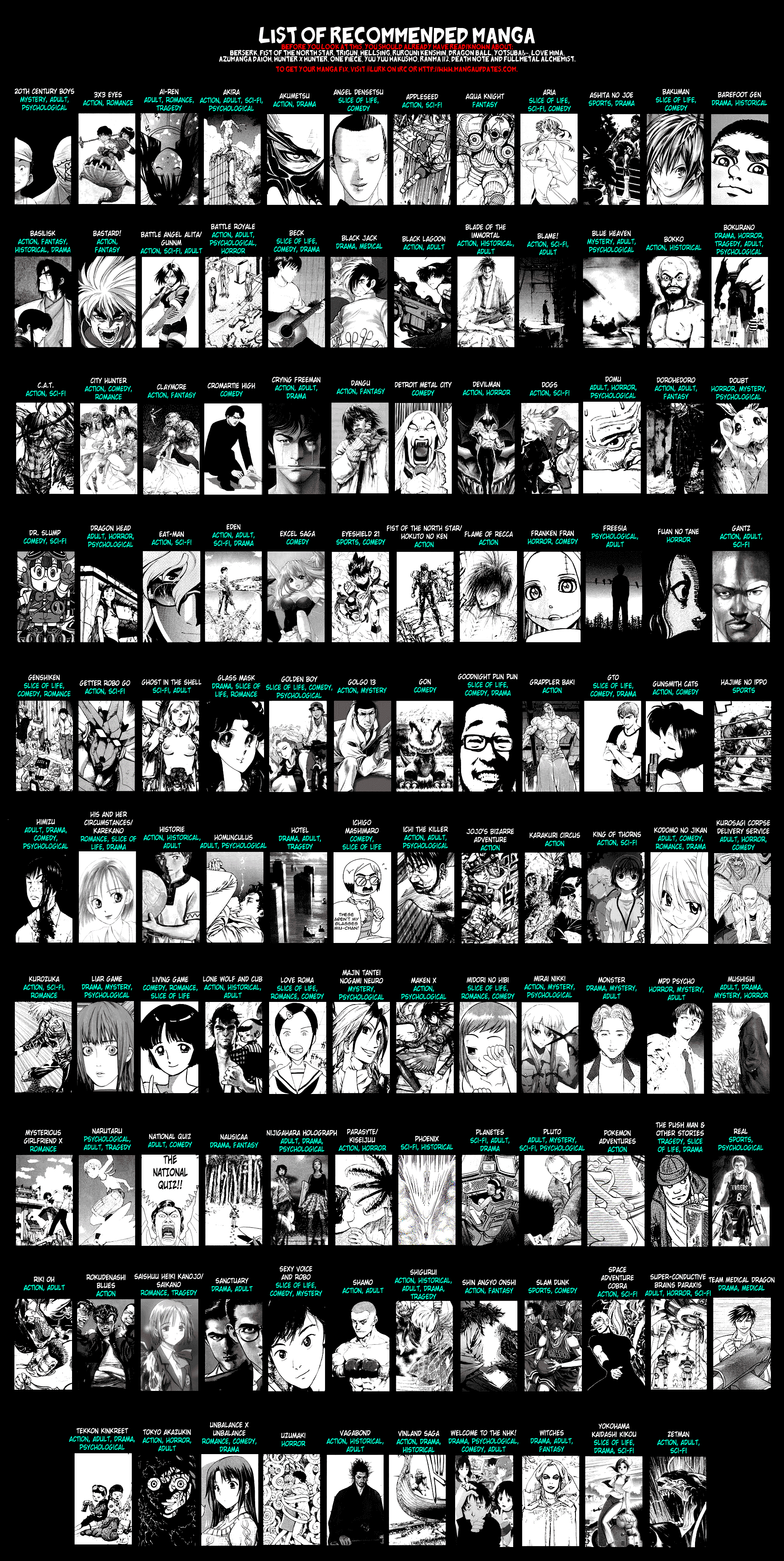 Q: Всё с адвайс-листов уже осилил, не знаю, что бы мне такое ещё почитать. A: В этом разделе есть хорошая серия тредов, "манга, которую читаю я". Иди в архив, открывай первые, уже давно утонувшие, треды, и выбирай те тайтлы, чьё описание от анонов понравилось.