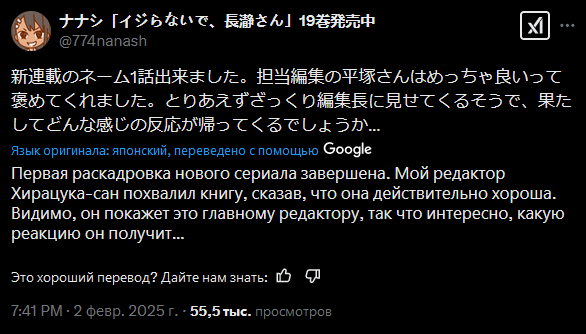 Нагаторо один из немногих вроде бы живых фандомов, но ощущение, что на японском рынке она бибу сосёт и потому тайтл душат. Хреновый мультик, который не спешат продолжать и задушеная сериализация манги