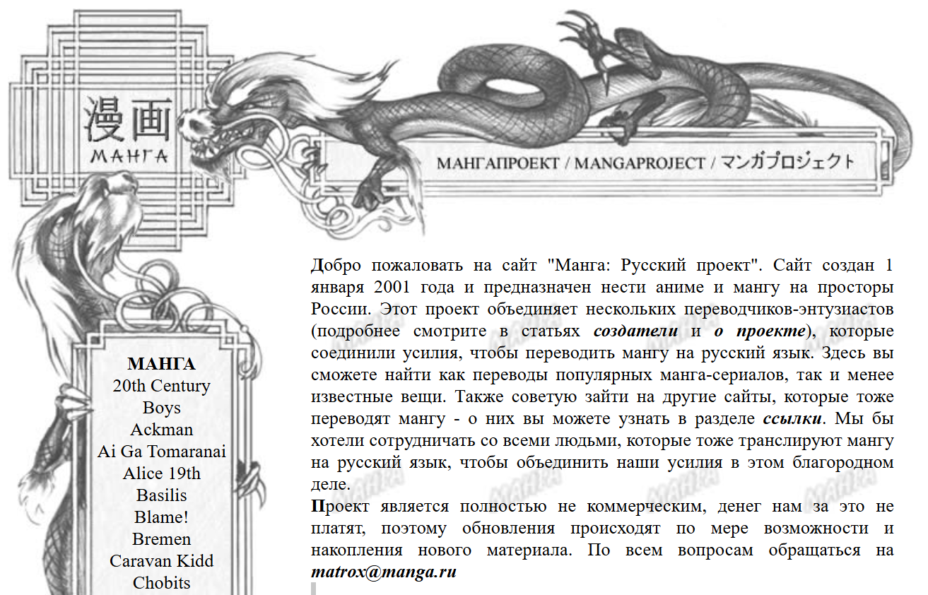 Охренеть. Нашёл сайт, с которого я начал вкат в мир манго лет 20 назад. Они блам переводили, йокогаму, лав хину, ранму. Залило ностальгией прямо. Хотя он, кажется, не на народе был. >Последнее обновление: 31 октября 2005 года Эх. p.s. Сайт мёртв, все ссылки на магазин ведут. Тоже мёртвый, хех. Наверное это какой-то сайт-замануха мимикрирующий. Но всё равно первая страница та самая. Спасибо и на том.