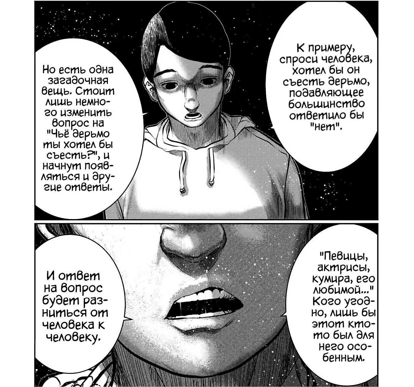Я давно бросил читать комменты потому что 90% там это шутки за 300 и спойлеры, изредка кто-то подмечал что-то что я сам не заметил, по итогу только тратишь на них время за которое можно 5 глав ещё прочитать. Мимо зумерок
