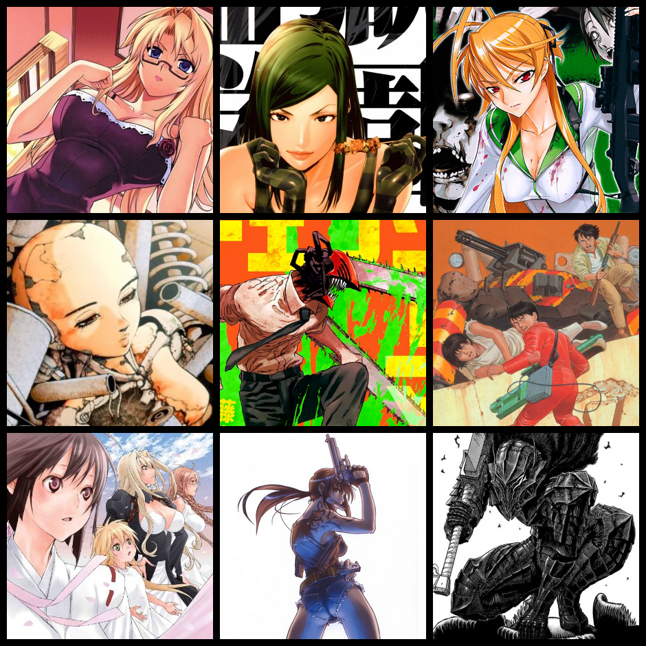 Шигуруи, лучше пока не придумали. Сиськи, гуро, терпение, попускания и унижения всех героев, охуительные бои и рисовка. Единственная манга, где я с напряжением листал боевые сцены, настолько дух захватывало кто кому и как пизды даст. Ну и Ганц еще, но там вторая половина скатывается.