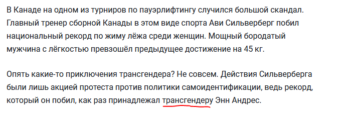 >>2090133 >А это ты сам так считаешь или реальные примеры какие-то есть со статистикой или вроде того? Посмотри нормативы для мужиков КМС и сравни с результатами женских чемпионок мира. Вот прямо сейчас происходят ситуации когда какой-нибудь чмошный недоКМСник вылезает из под шконки, объявляет себя бабой и начинает побеждать на серьезнейших чемпионатах. Хотя у него уровень такой, что до серьезных мужских соревнований таких вообще не пускают. >эта дискуссия уже в тупик заходит Ну потому за то что "тянки-бойцы в баки это хуйня, и хорошо что не автор не добавляет" есть аргументы как из манги, так и из ирл, а против только твое "как же хочется тяночку-писечку"