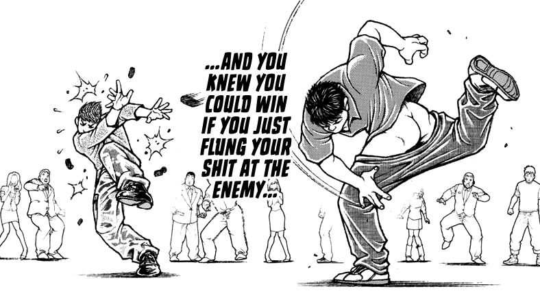 Ну и микро-момент про уязвимые точки. >А за удары пальцами в волшебные места на пузе, от которых человек вырубается/ взрывается иди в Кулак Северной Звезды. Так то они и тут есть, когда Баки с обезьяной дрался, он бил мо подобным точкам, но это, правда, не сработало. А вообще оно понятно, что бьют и по яйцам и по глазам, но вот по швам черепа били пару раз, хотя силы у персонажей его разорвать вполне хватит, учитывая ебанутость этой манги хотелось бы видеть подобной экзотики побольше, ну или удары по солнечному сплетению, в которое по-моему вообще ни разу не ударили, но здесь я не ручаюсь. Вообще я имел в виду, что с безумной силой персонажей для них уязвимых точек в теле противника будет побольше, чем для обычного человека. Я уверен, что если один персонаж ударит кулаком по колену другого, то его ногу в обратную сторону вывернет. Но в целом ты прав и уязвимые точки тут существуют, просто у меня в голове были мысли про что-то более необычное.