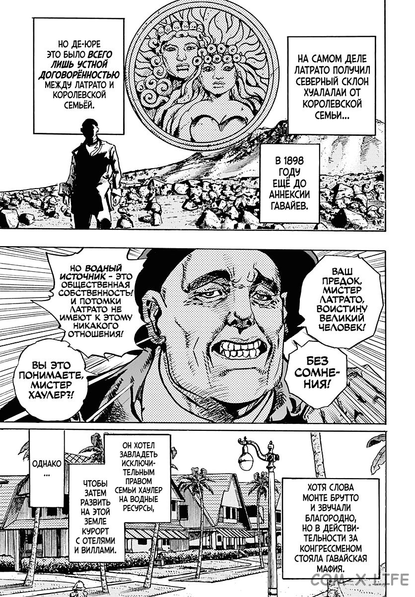 12 глава вышла, и всем похуй. Обсуждаем? Кто такой, ебать его в сраку, Чармингмэн? Нахуя нам показали эту слезливую историю про брата и очередной набульк про жестокость полиции? Лавовые трубки и лава это макгаффин типа локакаки и Видящих Стен из восьмёрки, Араки ударился в самоповтор?
