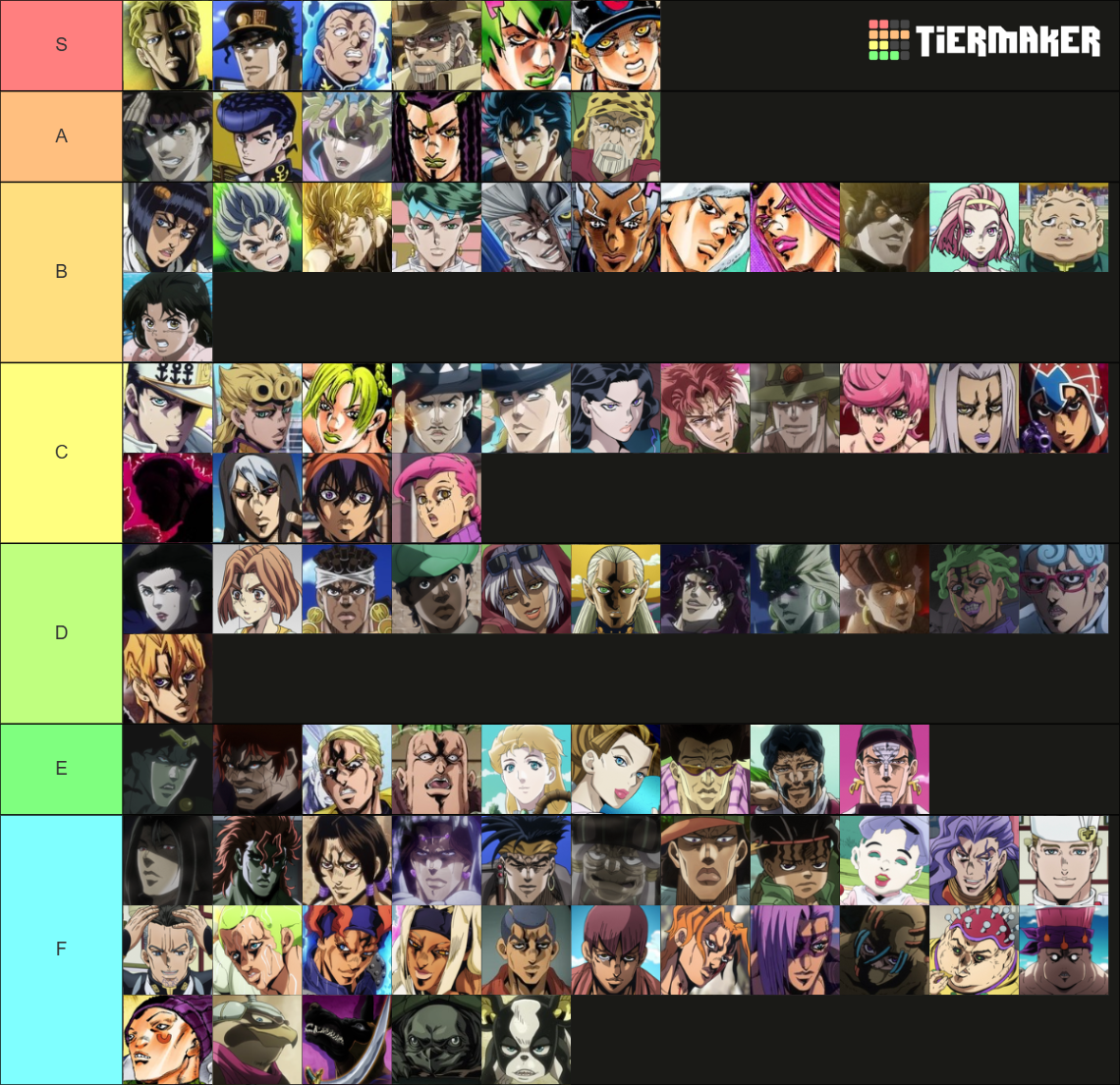 F Tier: 6 (вообще d, но f за любимый верс и Джотаро с его дочкой, а так... концовка пиздец, Эмпорио жалкая пародия на Хаято, путешествие героев хуйня, Пуччи кал, стенд юзеры вражки клоуны неинтересные и если честно я не помню что там происходило между комой Джотаро и концом истории)