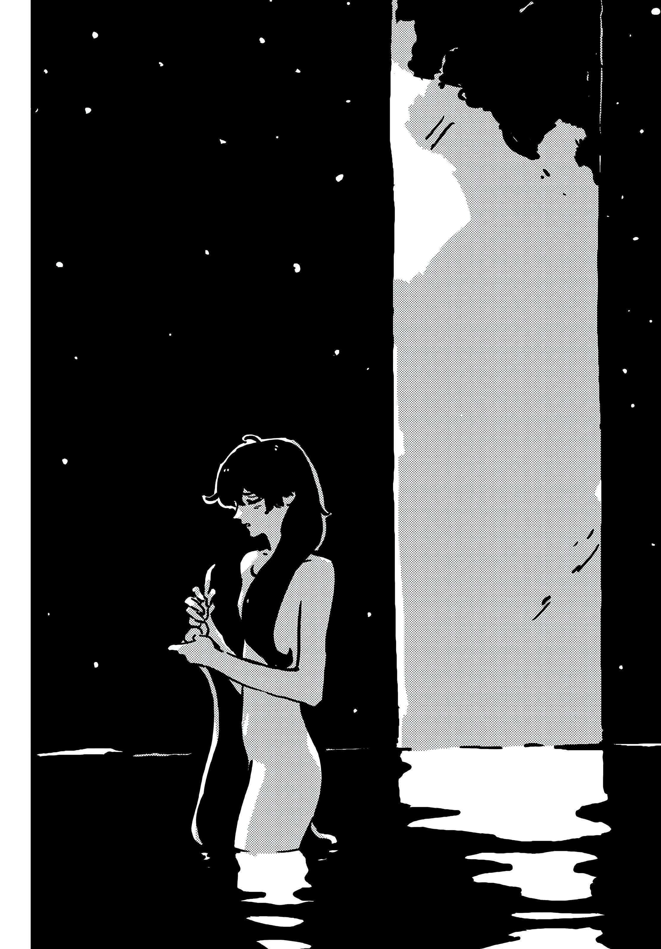 Диалогов в манге минимум, порой их нет вовсе на многих страницах, но это не обедняет повествование. Нихэй рассказывает историю через окружение: его умопомрачительные развороты, архитектурные детали, мрачную атмосферу заброшенных мегаструктур создают ни с чем не сравнимое ощущение путешествия по миру, где время и пространство потеряли всякий смысл.