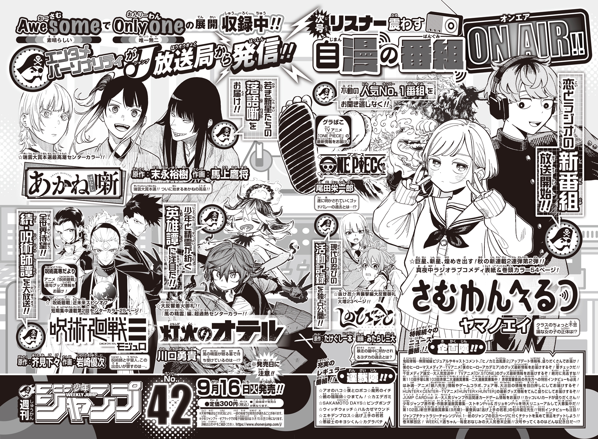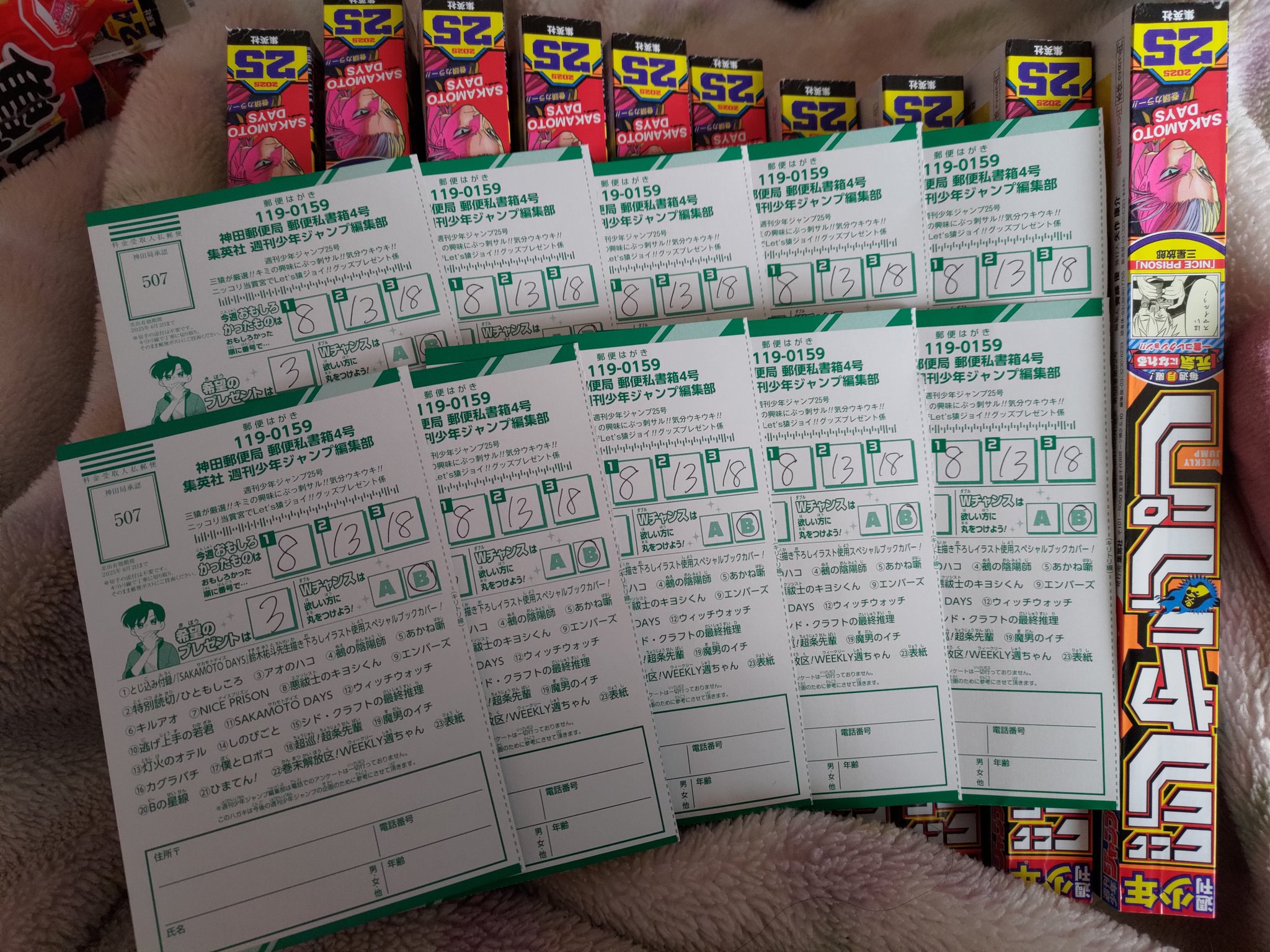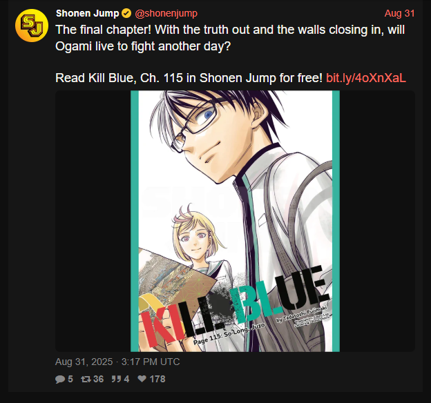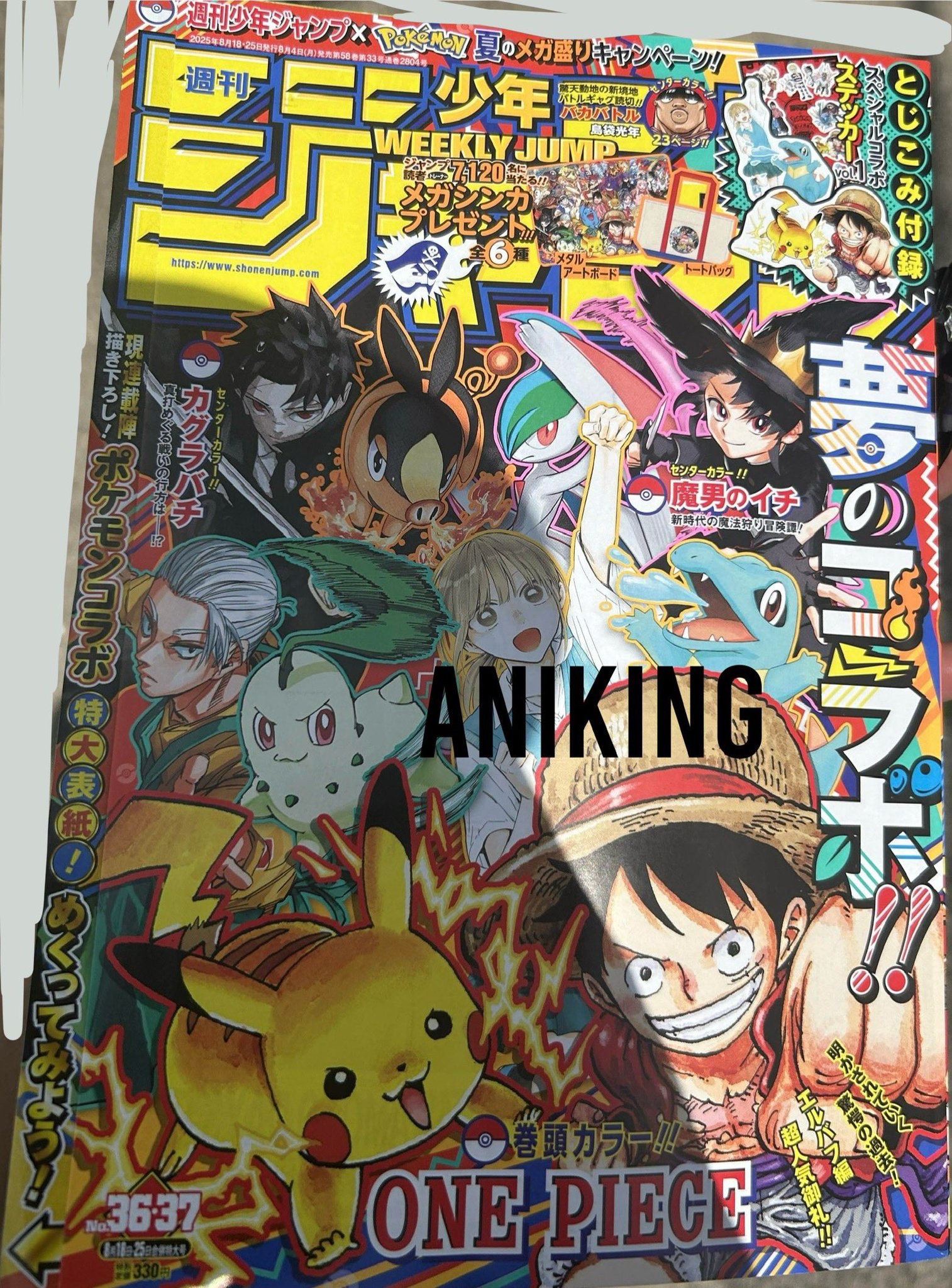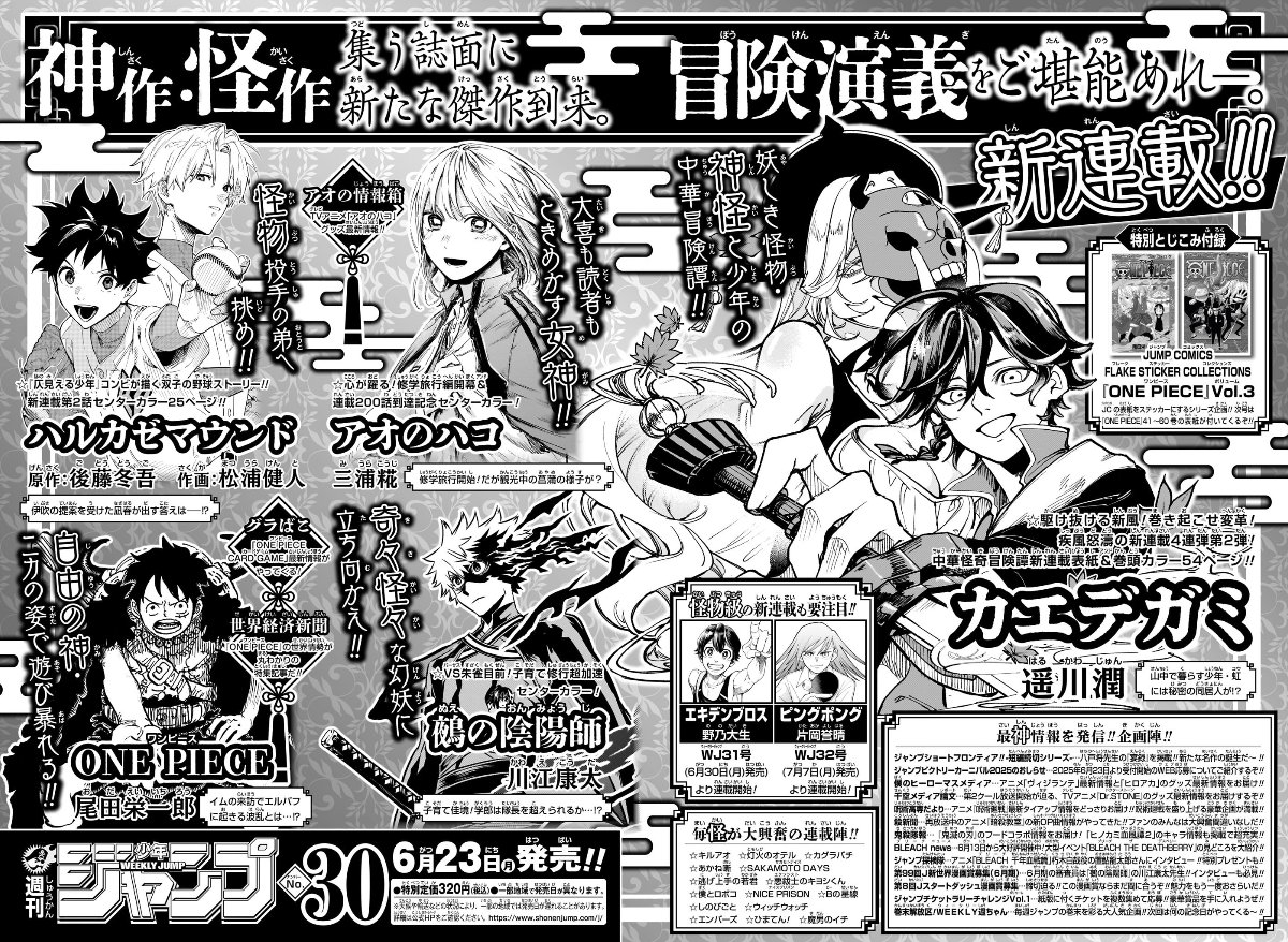 Weekly Shonen Jump Issue #31 (2025) Ekiden Bros (Cover & Lead Color Pages; 54p; New Series by Nono Daiki) Kagurabachi ONE PIECE Blue Box Me & Roboco Kaedegami (Color Page; Second Chapter) WITCH WATCH SAKAMOTO DAYS Ichi the Witch (Color Page) Harukaze Mound Otr of the Flame (First Ranking) Ultimate Exorcist Kiyoshi Akane-banashi Shinobi Undercover The Elusive Samurai (Color Page) Nue's Exorcist NICE PRISON Hima-Ten! Kill Blue Star of Beethoven (End of Serialization)