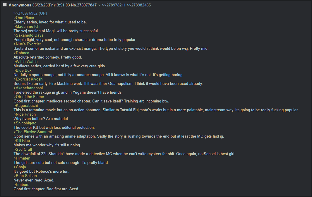 >>2490827 для современного джампа вполне. автор любой из текущих серий, году даже в 2015-м, не то что раньше, получил бы демонстративный посыл нахуй своего манускрипта в шредер вместо публикации они все очень слабые